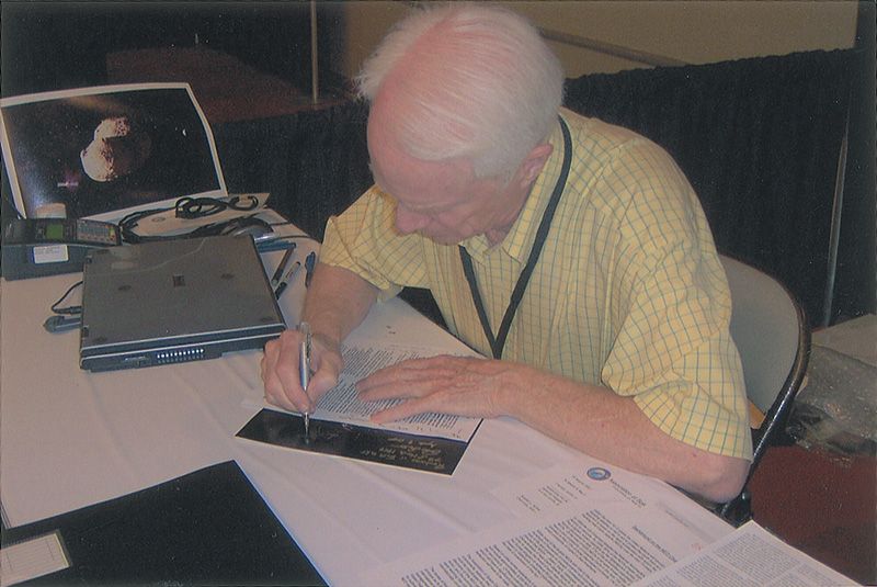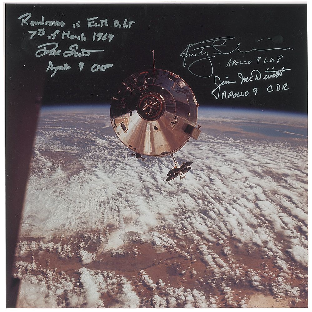 Exceptional color satin-finish 10 x 10 photo from of the Apollo 9 capsule in orbit, signed in silver ink, “Rendezvous in Earth Orbit, 7th of March 1969, Dave Scott, Apollo 9 CMP,” “Rusty Schweickart,” and “Jim McDivitt, Apollo 9 CDR.” In fine condition, with a strip of adhesive remnant on the reverse. Accompanied by a photo of Schweickart taken at time of signing.