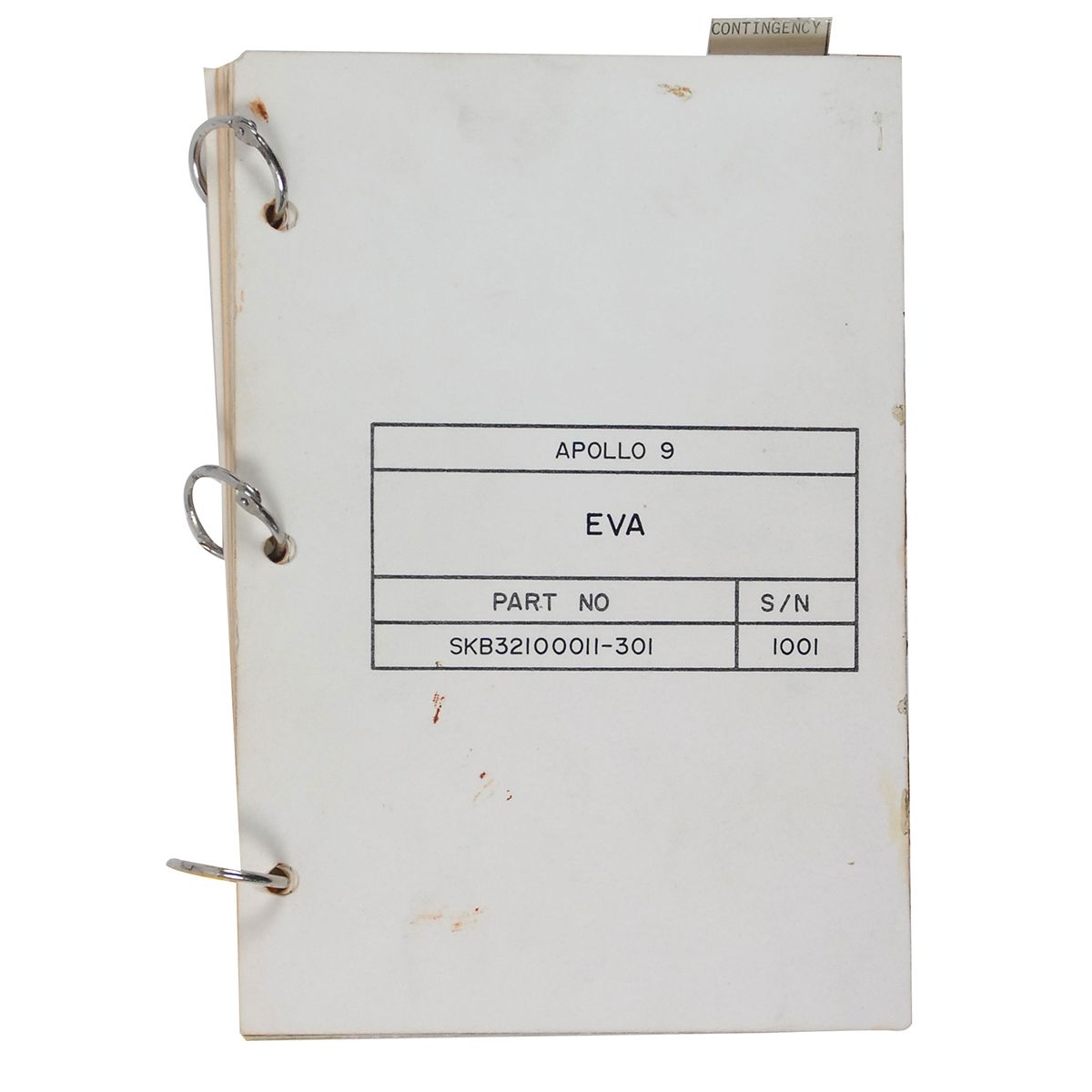Extremely rare Apollo 9 EVA checklist, flown on board the Lunar Module ‘Spider,’ measuring 6 x 8 and consisting of 24 (12 double-sided) heavy, cardboard stock pages and bound by its original three rings in the left edge. Printed on the front cover is “APOLLO 9 EVA PART NO SKB32l000l l-301 S/N 1001.” A unique extra 4? diameter ring is on the bottom of the back cover, to hook it onto the main control panel. Also, unlike the other checklists on this flight, each page has a Velcro tab and the cover has a Velcro strip to prevent them from floating away during the EVA.