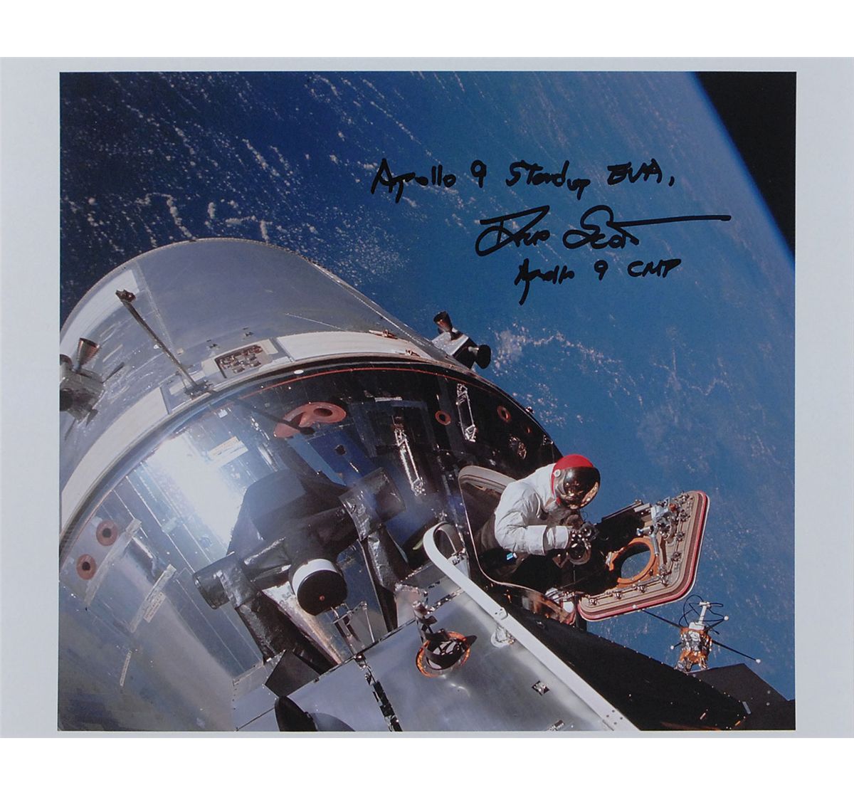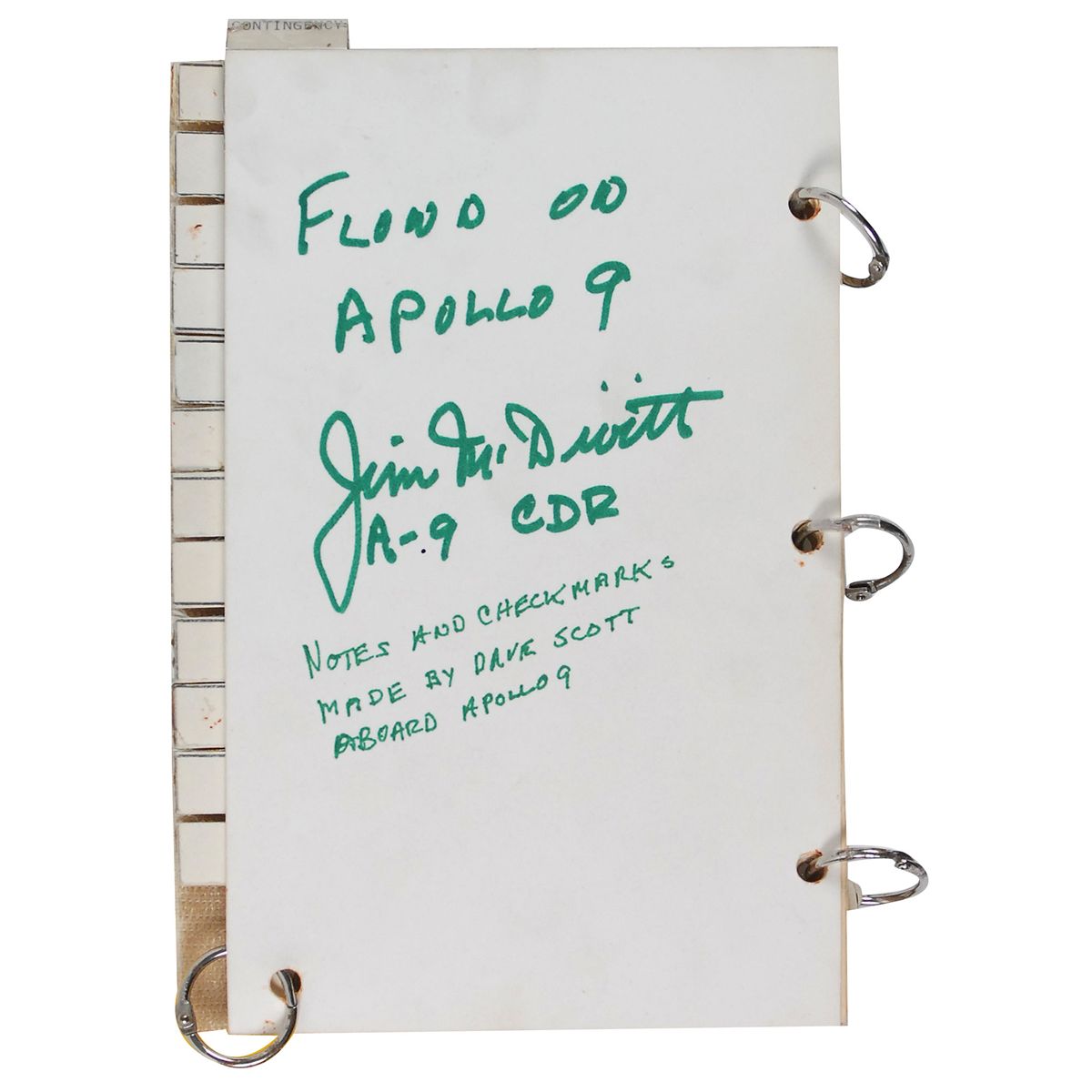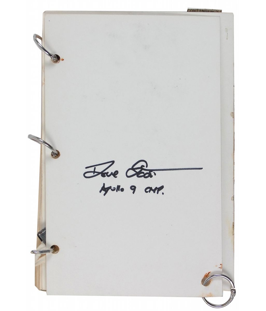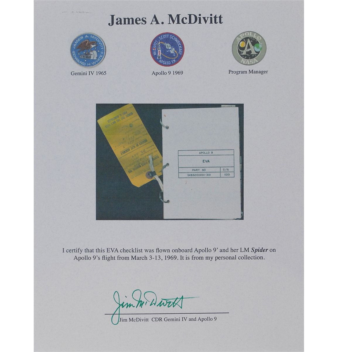 Attached to the bottom ring is original Temporary Parts Removal Tag (Form 961-D) from North American Aviation, which is rarely seen on complete checklists and an important part of this rare artifact’s chain of custody. In fine condition. Accompanied by a signed certificate of authenticity from McDivitt which reads, “I certify that this EVA checklist was flown onboard Apollo 9 and her LM Spider on Apollo 9’s flight from March 3–13, 1969. It is from my personal collection.” Also accompanied by two signed color satin-finish photos of the two astronauts who participated in the space walk: an 8 x 10 of Rusty Schweickart, signed and inscribed in silver ink, “To Art—Shakedown cruise of the first Apollo EVA & PLSS. Rusty Schweickart, Apollo 9 LMP”; and a 10 x 8 of Scott standing in the hatch of the command module, signed in black felt tip, “Apollo 9 stand up EVA, Dave Scott, Apollo 9 CMP.” The final accompaniments are two color photos of Scott and McDivitt holding the checklist after signing.