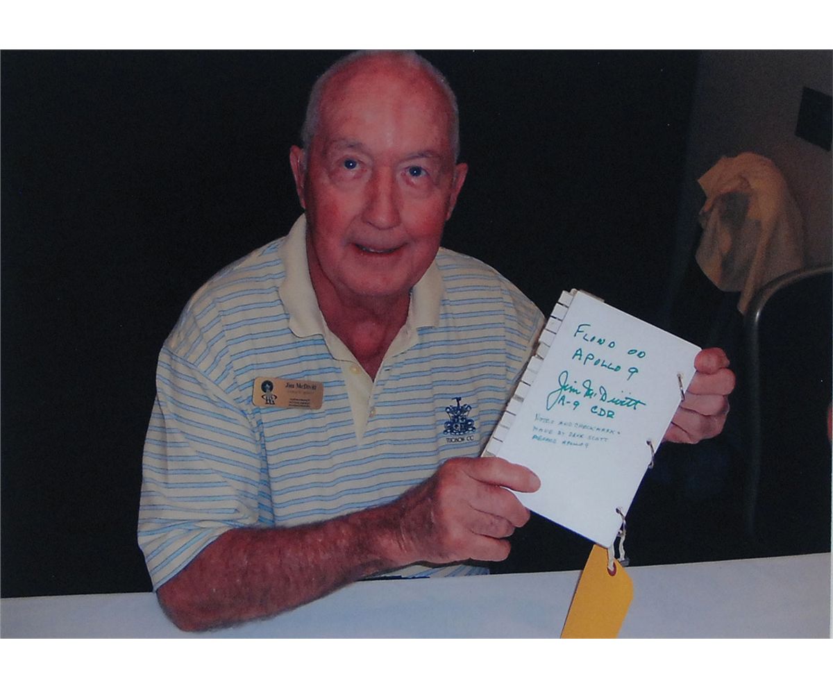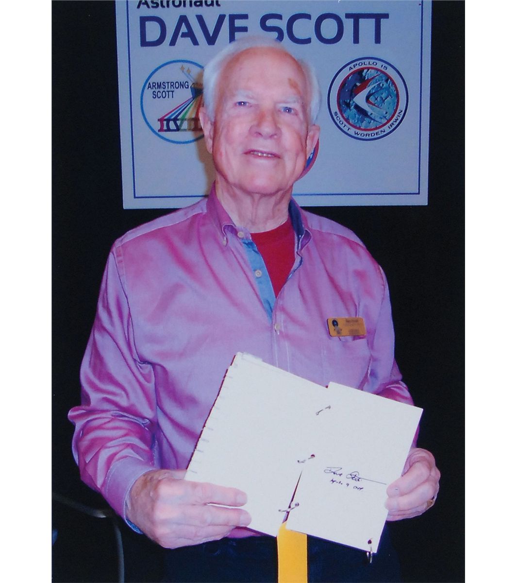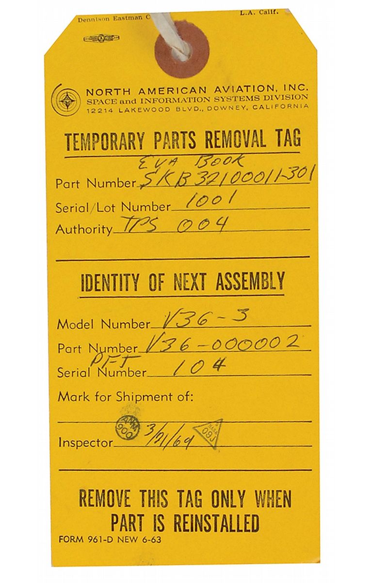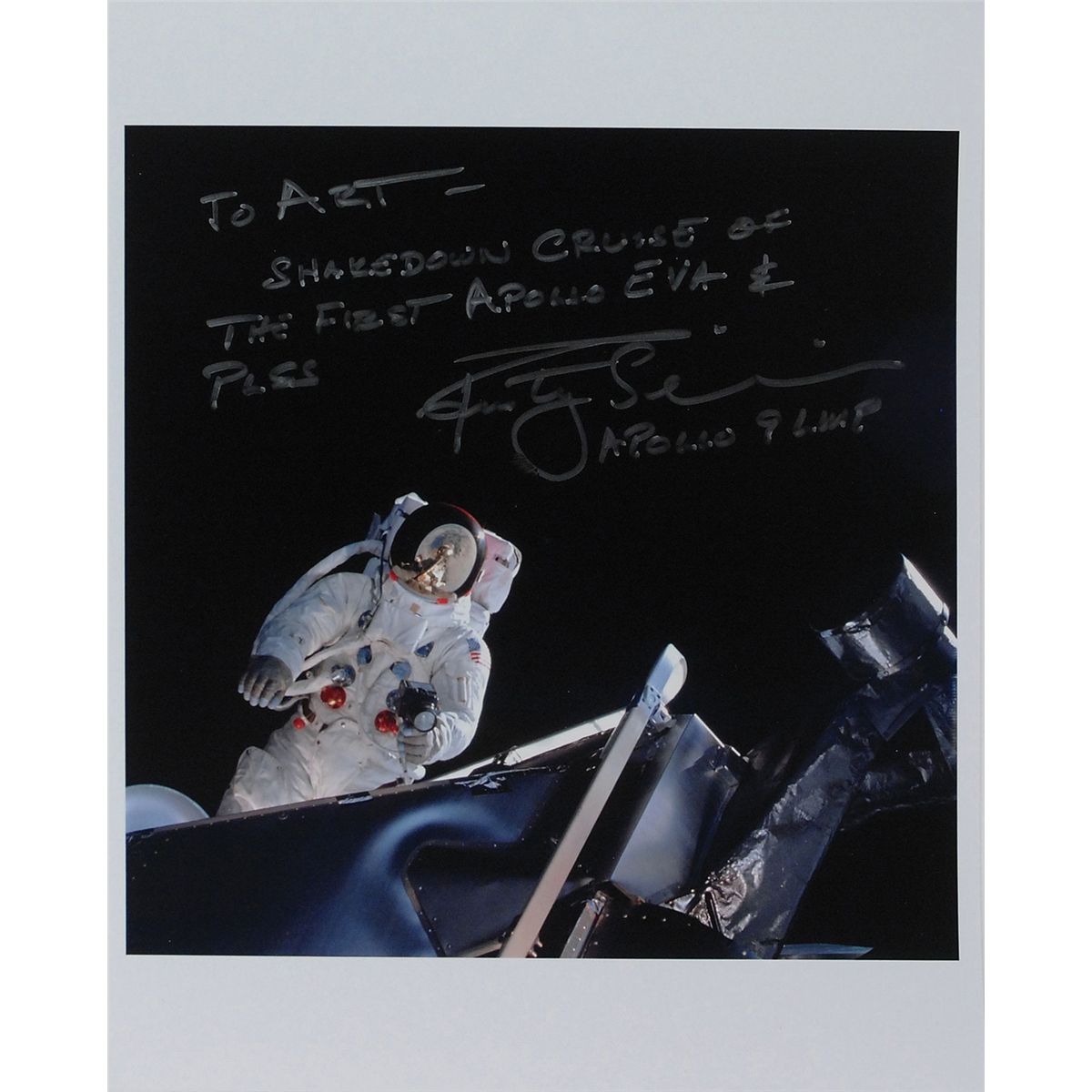 Attached to the bottom ring is original Temporary Parts Removal Tag (Form 961-D) from North American Aviation, which is rarely seen on complete checklists and an important part of this rare artifact’s chain of custody. In fine condition. Accompanied by a signed certificate of authenticity from McDivitt which reads, “I certify that this EVA checklist was flown onboard Apollo 9 and her LM Spider on Apollo 9’s flight from March 3–13, 1969. It is from my personal collection.” Also accompanied by two signed color satin-finish photos of the two astronauts who participated in the space walk: an 8 x 10 of Rusty Schweickart, signed and inscribed in silver ink, “To Art—Shakedown cruise of the first Apollo EVA & PLSS. Rusty Schweickart, Apollo 9 LMP”; and a 10 x 8 of Scott standing in the hatch of the command module, signed in black felt tip, “Apollo 9 stand up EVA, Dave Scott, Apollo 9 CMP.” The final accompaniments are two color photos of Scott and McDivitt holding the checklist after signing.