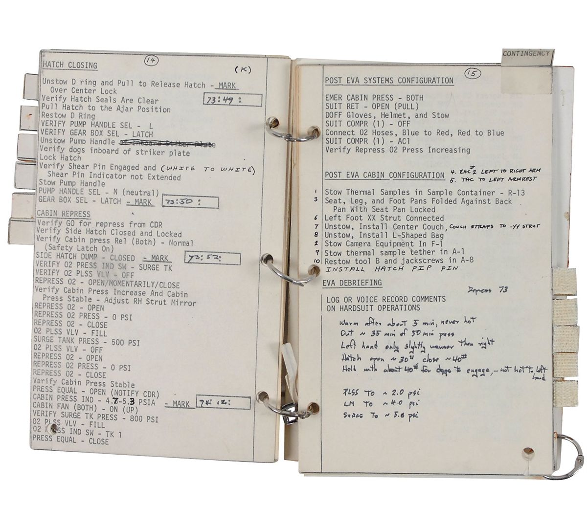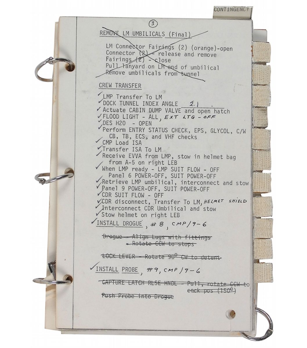 This rare complete checklist, heavily notated by Dave Scott, covers the preparation for the stand up EVA performed by CMP Dave Scott, as well as LMP Rusty Schweickart’s preparation of the Portable Life Support System (PLSS); the steps scheduled for his space walk, and the depressurization and pressurization of the Command Module Gumdrop. There are dozens of checkmarks thoughout the checklist which includes the procedures for the unstowing of EVA utility and camera equipment; crew transfer from CM to LM; Command Module Preparation; Crew Status; PLSS Comm Check (EVA COMM CONFIG); System Prep for Depress; ECS Redundant Component Check; Final Prep for Depress; Suit Test; Hatch Opening; Hatch Closing; Cabin Repress; Post EVA Systems Configuration; Post EVA Cabin Configuration; and the actual original procedures the EVAs of both the CMP and LMP. Schweickart was originally scheduled to make an EVA transfer on the outside of the Lunar Module over to the Command Module and transfer back to the Lunar Module (in the event of a future emergency rescue). However, due to his bout of space sickness the day before—the procedures outlined were scrubbed and Rusty stepped outside of the Lunar Module Spider and stood on the LM porch inserting his feet into the ‘Golden Slippers’ which are indicated in this checklist. Dave Scott would do a stand up EVA in the CM hatch and grab the experiments Rusty would otherwise have retrieved. The procedures herein reflect the original 2 hours and 25 minutes of activity originally planned for two sunrises and two sunsets. The checklist also has a tabbed Contingency section, in the event of other critical needs, to closing the hatch and cabin depress and repress.