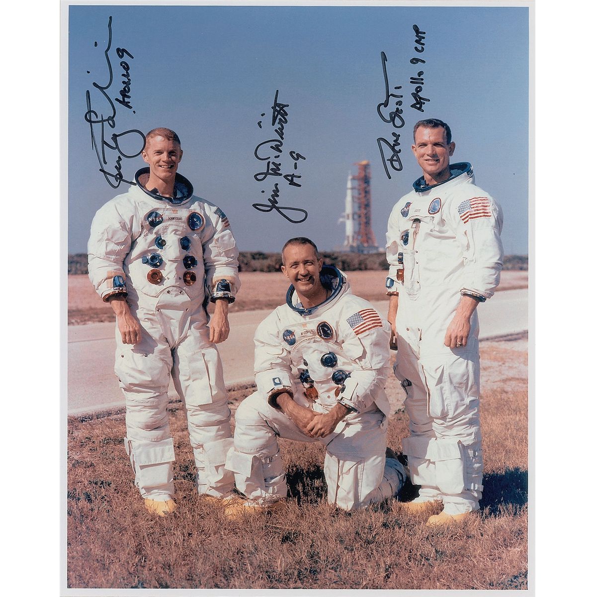 Color satin-finish 8 x 10 photo of the crew posing outdoors in their space suits, their spacecraft in the background on the launch pad, signed vertically in black felt tip, “Jim McDivitt A–9,” “Dave Scott Apollo 9 CMP,” and “Rusty Schweickart Apollo 9.” In fine condition.