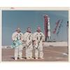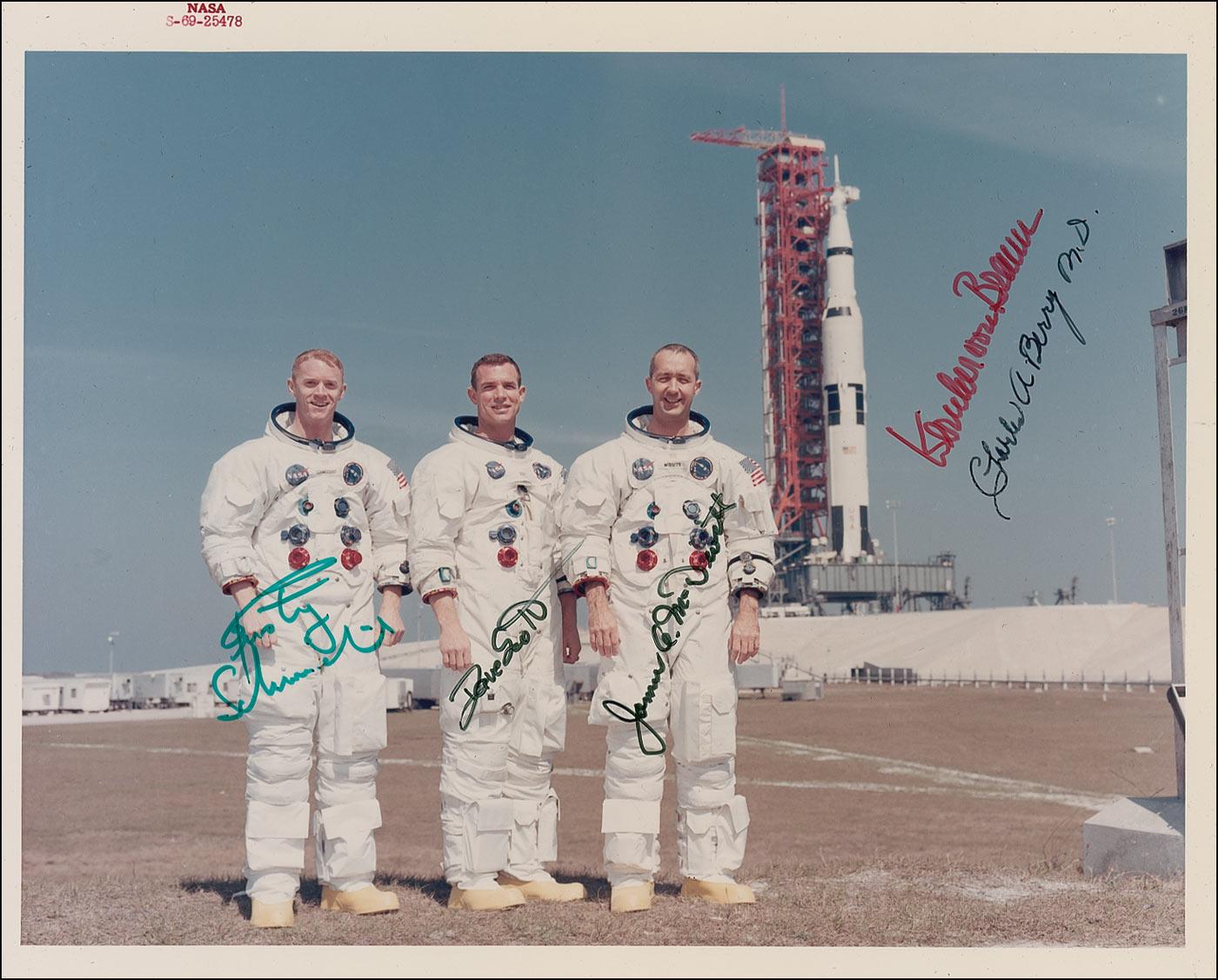 Color vintage 10 x 8 NASA ‘red-numbered’ photo, signed in black felt tip by Dave Scott and James McDivitt, and in green felt tip by Rusty Scheickert. Photo is also signed in red felt tip by Werner von Braun and in black ink by Charles Berry, MD of the Space Medicine Library. In fine condition. Any NASA numbered photo is indicative of being an original NASA photograph, and red-numbered NASA glossies are very desirable, and harder to find.