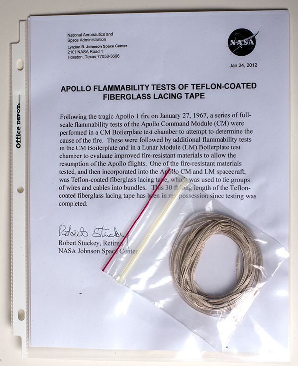 Apollo 1, 1967, Flamability Test Teflon Lacing and Kapton Insulation Samples. Lot of two different samples include a piece of Kapton covered twisted two-conductor wire (60+ inches) and a large piece of Teflon-coated Fiberglas tape (several feet worth). Both types of material passed testing and were later used in the Apollo and/or Shuttle Programs. Copies of Stuckey COs are included with each piece. Attractive and interesting.
