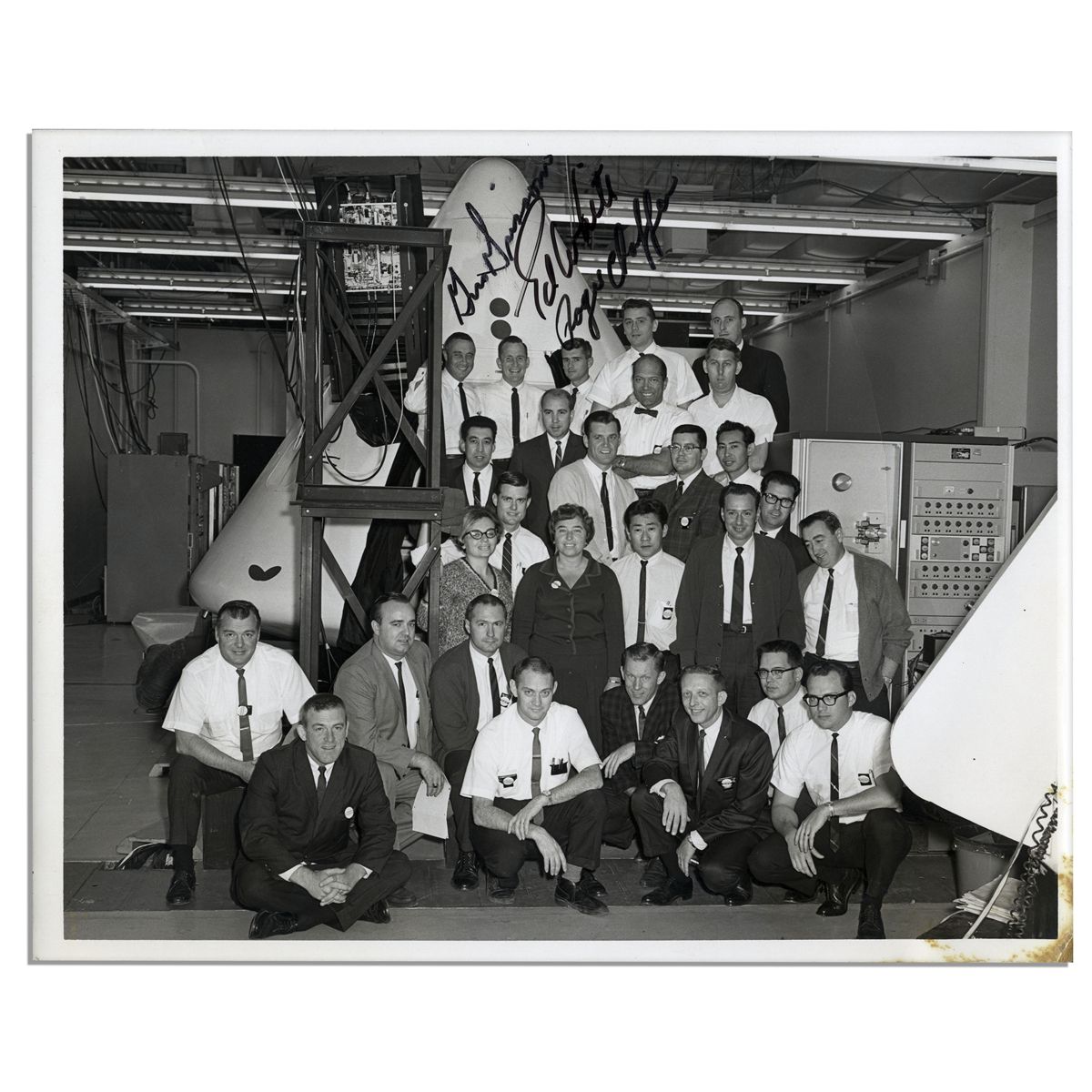 Photo signed by the Apollo 1 crew, ''Gus Grissom'', ''Ed White'' and ''Roger Chaffee'' in black felt tip. Image captures the Apollo 1 astronauts with employees from the Command Module design team at North American Aviation. Glossy photo measures 10'' x 8''. Light soiling to lower right corner and light buckling. Near fine. With PSA/DNA COA for all signatures.