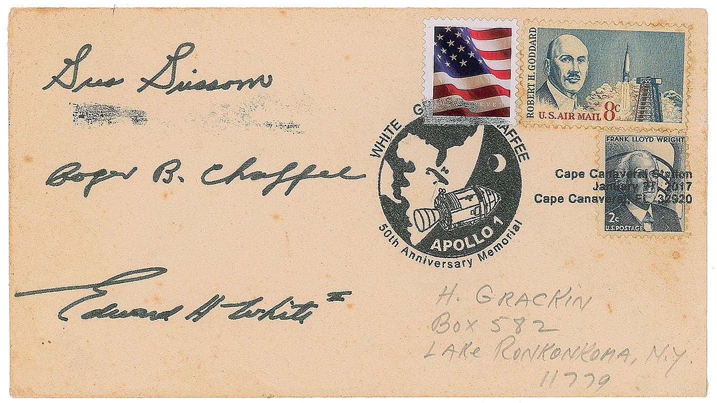 Extremely rare postal cover featuring autopen signatures of Apollo 1 crewmen Gus Grissom, Roger Chaffee, and Ed White, bearing a later postmark added at Cape Canaveral on January 27, 2017, for the 50th anniversary of the tragic Apollo 1 pad fire. In fine condition. From the collection of aerospace memorabilia specialist Ken Havekotte, who notes that this is the only known Apollo 1 autopen crew-signed cover.