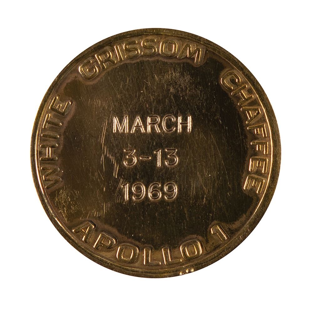 A few Apollo 1 medallions were carried in Jim McDivitt's PPK aboard Apollo 9 as a favor to the families of the astronauts who died in the Apollo 1 fire. One of the Apollo 1 astronauts, Ed White II, had flown with McDivitt on the Gemini 4 mission. McDivitt carried one gold-plated medallion for each of the surviving widows and silver-plated ones for each child. After Apollo 9 returned, the flown medallions were engraved on the reverse with the dates of the mission. This offered example was presented to White‰Ûªs widow, Patricia Eileen Finegan, and remained with her family until its sale at auction in 2001.