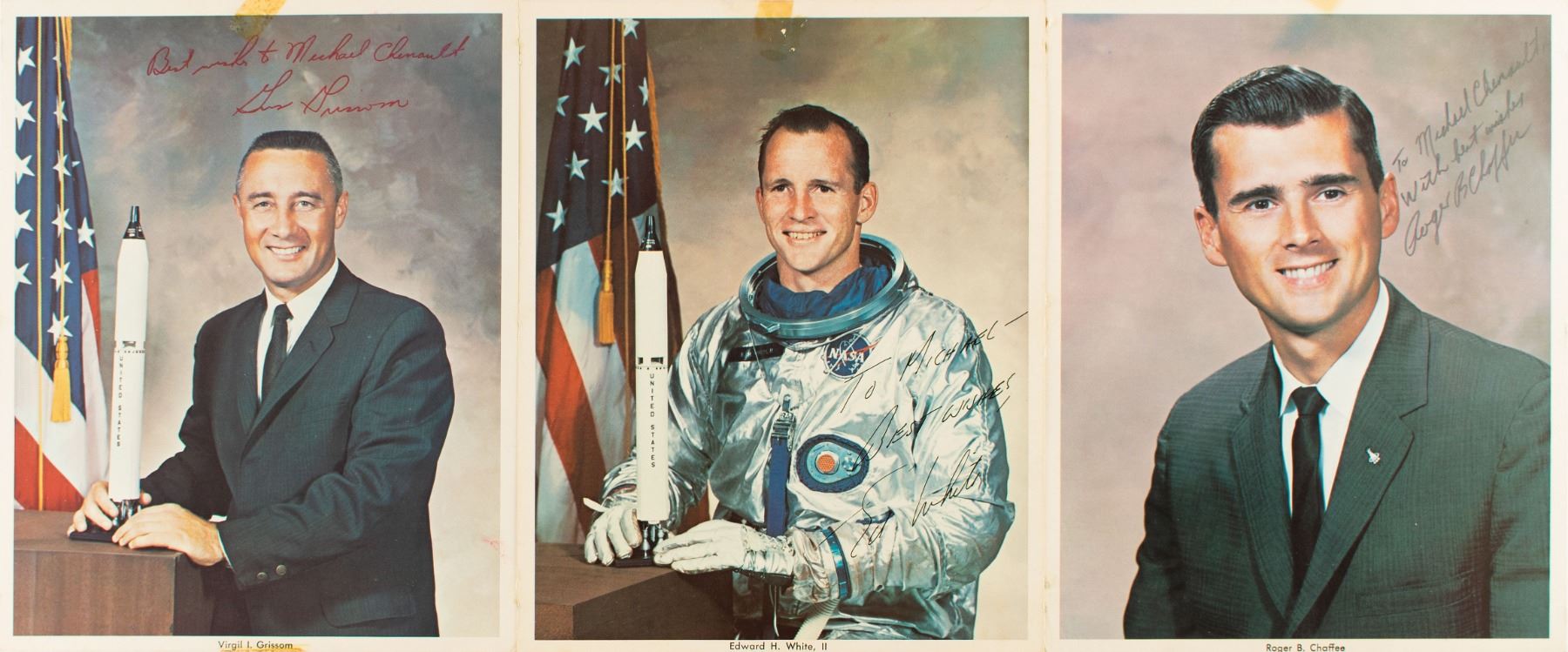 Rare and outstanding group of three early official color 8 x 10 NASA lithographs of the Apollo 1 crewmen, individually signed and inscribed in ink, "Best wishes to Michael Chenault, Gus Grissom," "To Michael—Best Wishes, Ed White," and "To Michael Chenault, With best wishes, Roger B. Chaffee." In overall very good to fine condition, with old tape stains to the top edges. The three would tragically perish in the Apollo 1 fire on January 27, 1967.