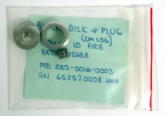 Apollo 10, 1969, FLOWN Fire Extinguisher "Rupture Burst Disc" & Bottom Fill Port Plug". As removed, postflight, from the Command Module (CM 106) fire extinguisher (ID Number ME 280-0010-0003, SN 652570008 HHH) flown on the flight. A certificate of authenticity from the NASA Subsystem Manager who rendered each extinguisher sale for post-flight display, is included. Unique.