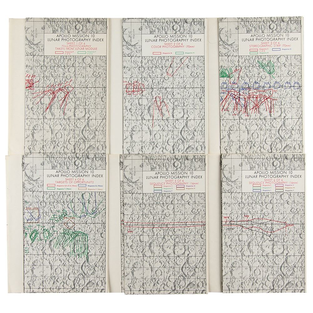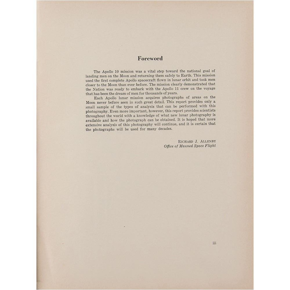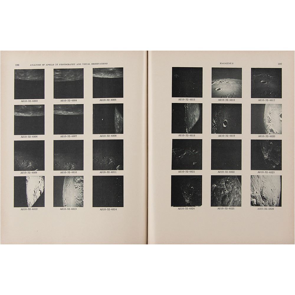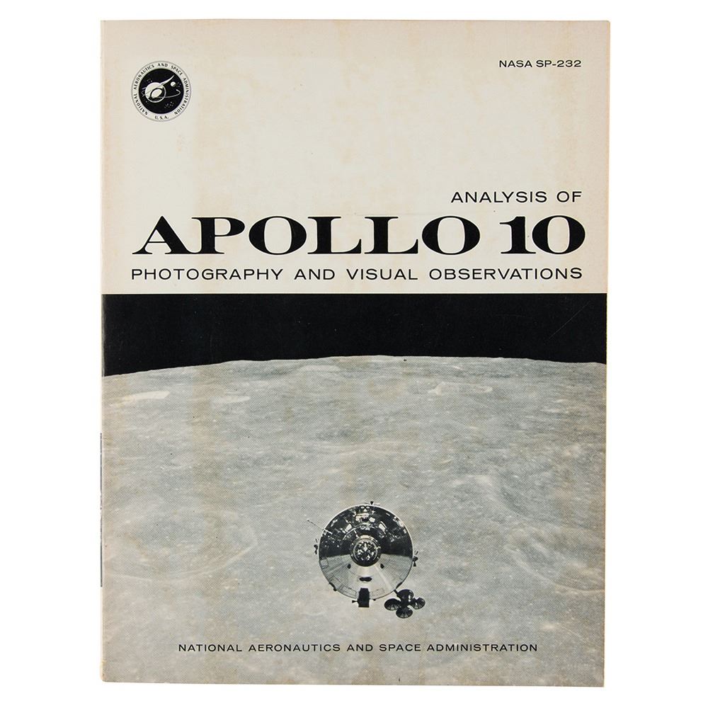 Softcover report entitled "Analysis of Apollo 10 Photography and Visual Observations (NASA SP-232)," issued by NASA's Scientific and Technical Information Office in 1971, 226 pages, analyzing the Apollo 10 crew's visual observations of the lunar surface and cataloging the photographs taken during the mission. Includes the six large folded Apollo 10 Lunar Photography Index maps. In very good to fine condition, with irregular toning to covers and corner creases to a couple of the maps.