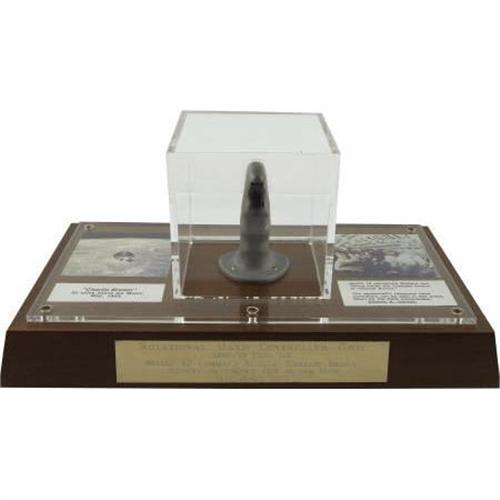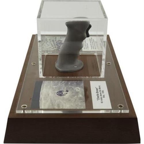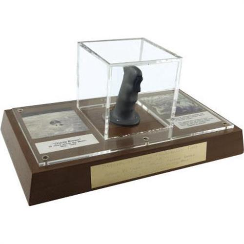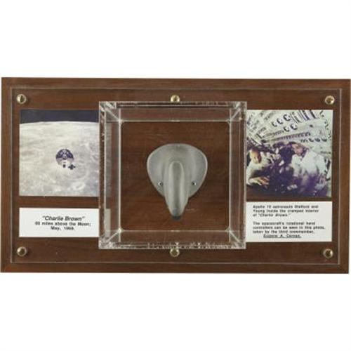 <B>Apollo 10 Command Module Flown Rotational Controller Handle</B></I> from the Charlie Brown CM, presented to Lunar Module Pilot Gene Cernan. A milled aluminum handle, approximately 4.5" tall with a black "trigger" and indented finger grips. It is custom mounted under Plexiglas to a heavy wooden mount with an overall size of 17" x 9.5" x 7.75". With it are two snapshot size photos, one of the CM sixty miles above the moon, and the other of astronauts Tom Stafford and John Young inside the CM with the rotational hand controllers visible in the photo. This is one of two such handles from this flight. The engraved plate on the side of the display exhibits the following text:<BR><center>ROTATIONAL HAND CONTROLLER GRIP<BR>REMOVED FROM THE<BR>APOLLO 10 COMMAND MODULE "CHARLIE BROWN"<BR>FOLLOWING ITS HISTORIC TRIP TO THE MOON.<BR>MAY 18-26, 1969</center><BR><BR>The Apollo 10 mission to the moon in May 1969 was the final, full-scale dress rehearsal for the first lunar landing achieved by Apollo 11 just two months later. Apollo 10 accomplished several space "firsts", including the first rendezvous and docking of two spacecraft in lunar orbit. During reentry in their Command Module <I>Charlie Brown</B></I>, the Apollo 10 crew reached the fastest speed ever achieved by a human, 28,529 statute miles per hour. This is a record that potentially will not be broken until the first astronauts return from Mars. Control of the Command Module to achieve these space milestones was conducted using the two onboard hand controllers. <I>From the personal collection of Captain Gene Cernan accompanied by written authentication by Cernan.</B></I><BR><BR><BR><b>Shipping:</b> Requires 3rd Party Shipping (<a target="_blank" href="http://www.heritageauctions.com/common/shipping.php">view shipping information</a>)