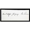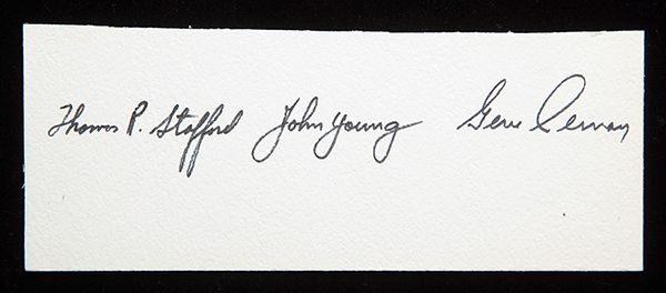 Apollo 10 Crew Autographs. Tom Stafford, John Young and Gene Cernan all signed this piece of presentation board. The presentation board measures 2 ¾ x 6 ¾". All are nice bold signatures and would go nicely with a piece of Apollo 10 memorabilia.