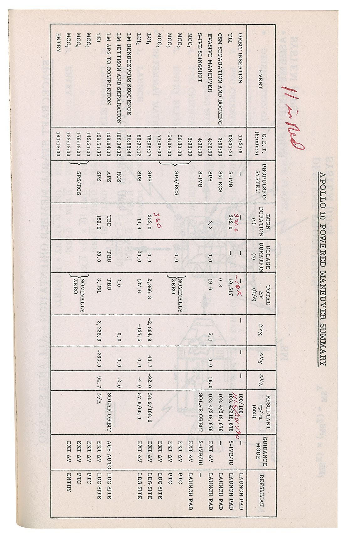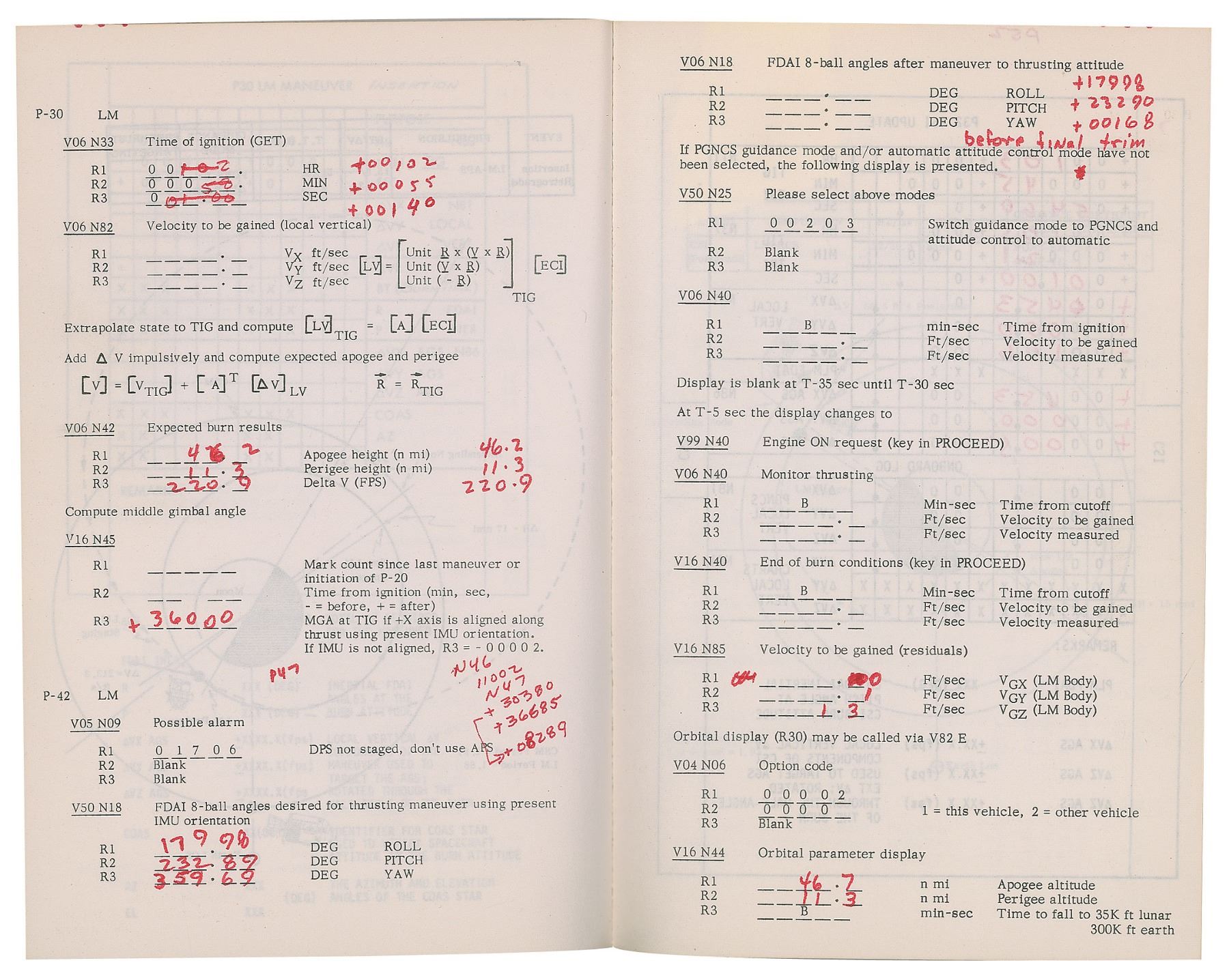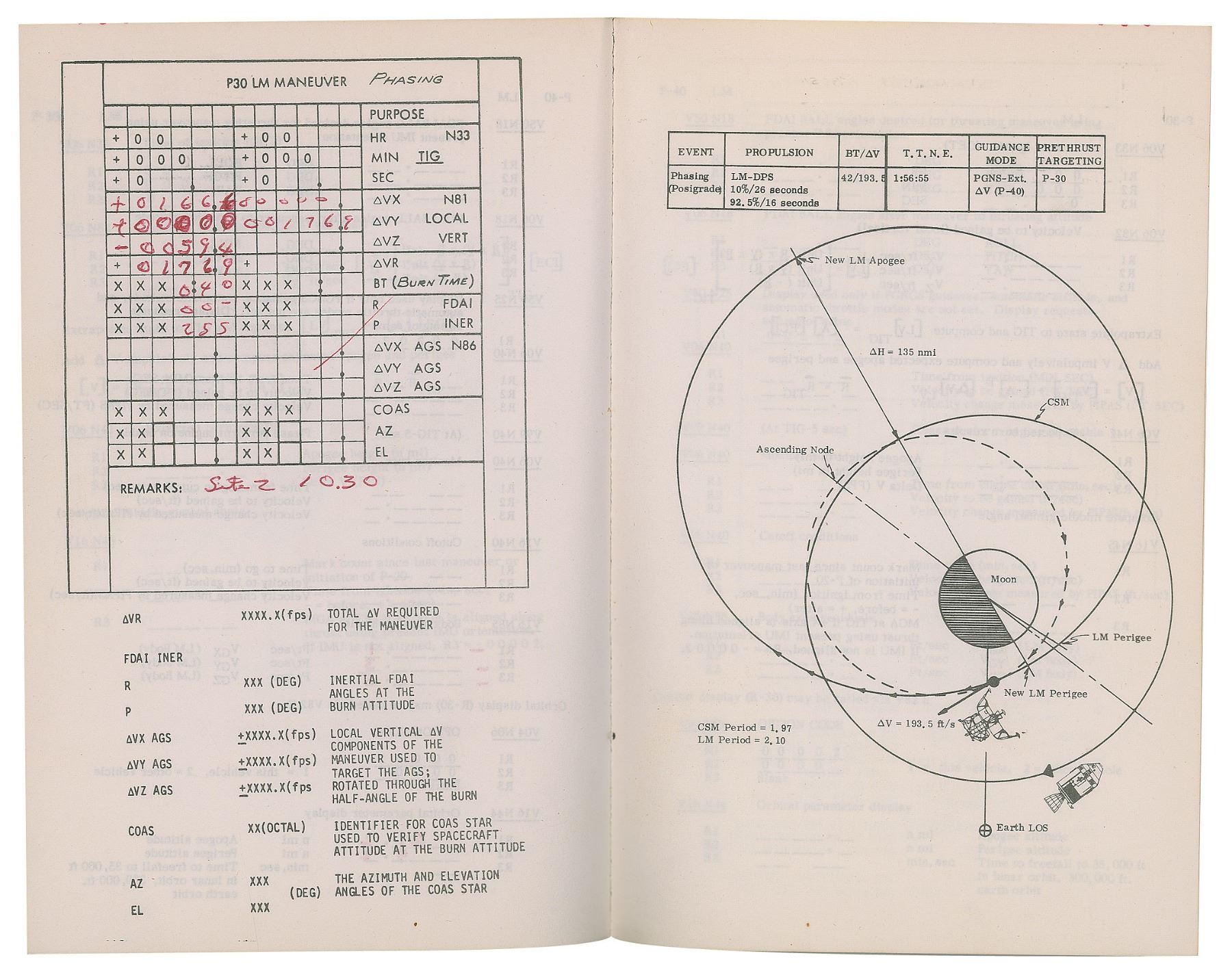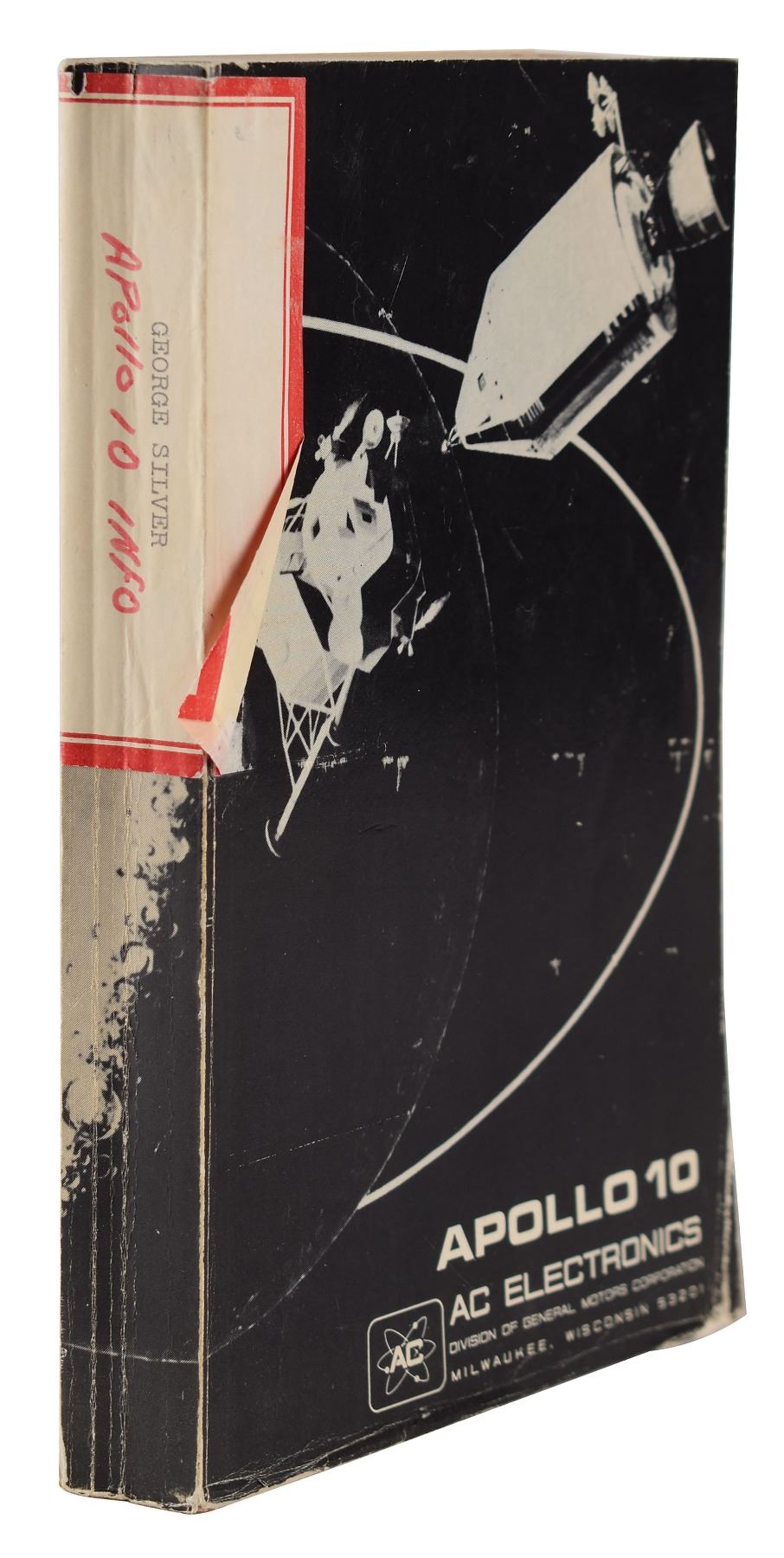 Apollo 10 "Guidance and Navigation Summary" manual by Delco Electronics, used by MIT engineer George Silver, 5.5 x 8.5, annotated on the top textblock edge, "Silver," with a label on the spine, annotated, "Apollo 10 Info." The manual has sections on "CM Software," "LM Software," "ASPO 45 CRT Displays," "Launch and Burn Schedule," "Burn Perturbations," "Entry," "Optics," "PIPA," "Coarse Align–Fine Align," "Digital Autopilot," and "Miscellaneous." It contains numerous diagrams, instructions, lists, and code definitions related to the guidance and navigation systems used on the Apollo 10 lunar orbital mission. There are several annotations inside made during the mission. In fine condition, with light wear from use. Silver was stationed at Cape Canaveral where he prepared the spacecraft guidance systems for flight.