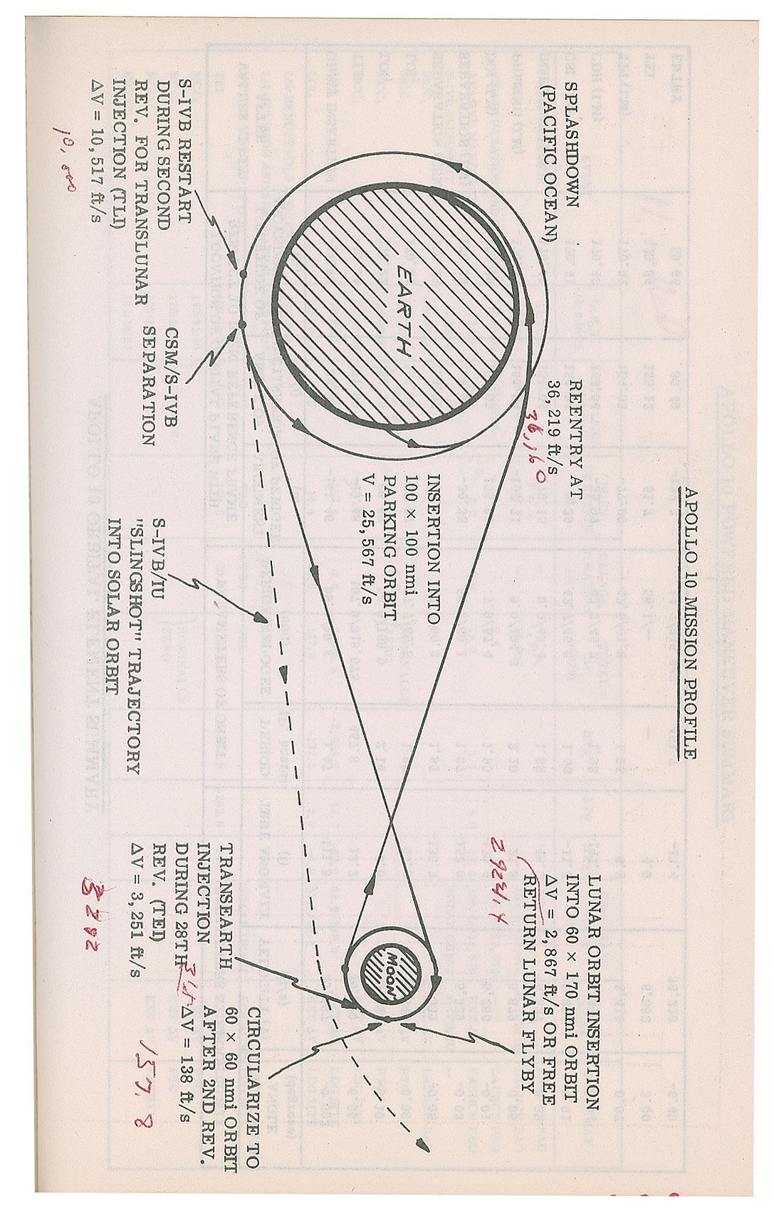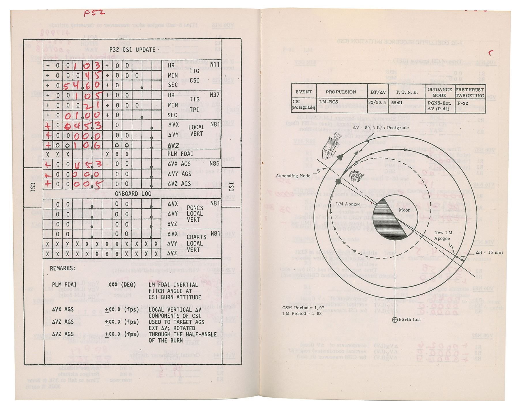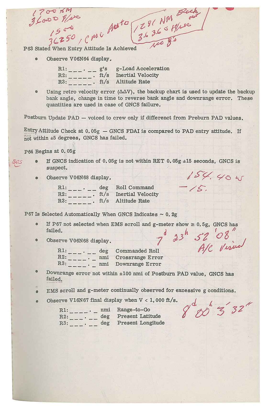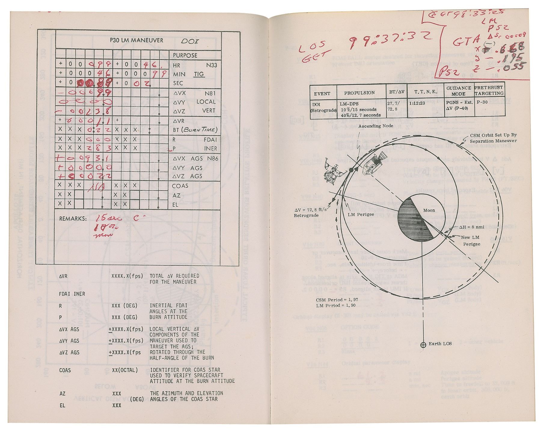 Apollo 10 "Guidance and Navigation Summary" manual by Delco Electronics, used by MIT engineer George Silver, 5.5 x 8.5, annotated on the top textblock edge, "Silver," with a label on the spine, annotated, "Apollo 10 Info." The manual has sections on "CM Software," "LM Software," "ASPO 45 CRT Displays," "Launch and Burn Schedule," "Burn Perturbations," "Entry," "Optics," "PIPA," "Coarse Align–Fine Align," "Digital Autopilot," and "Miscellaneous." It contains numerous diagrams, instructions, lists, and code definitions related to the guidance and navigation systems used on the Apollo 10 lunar orbital mission. There are several annotations inside made during the mission. In fine condition, with light wear from use. Silver was stationed at Cape Canaveral where he prepared the spacecraft guidance systems for flight.
