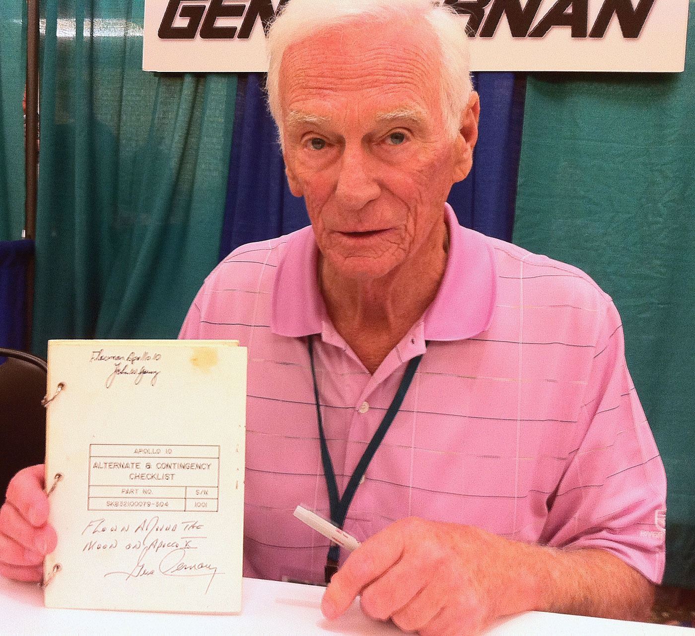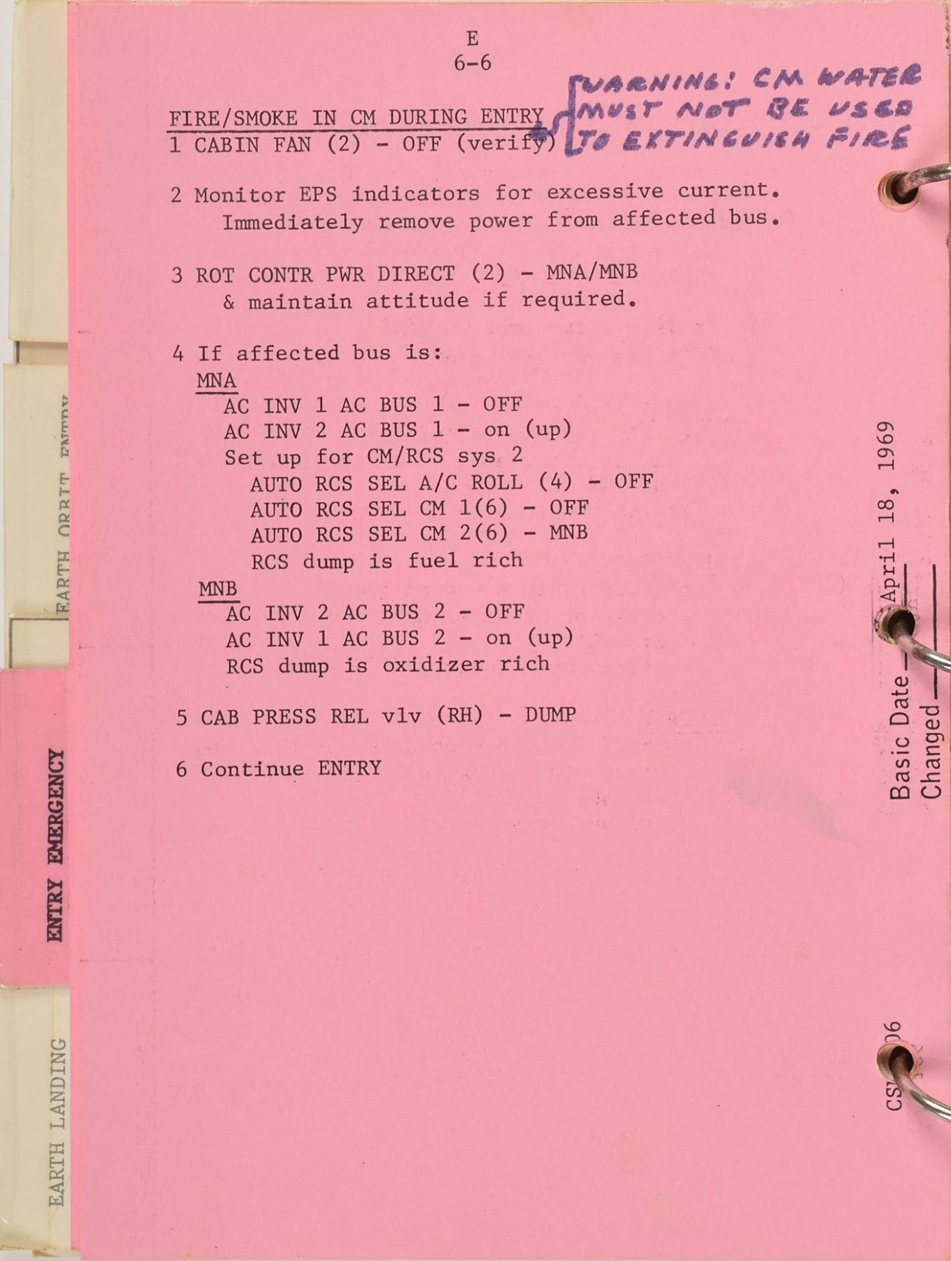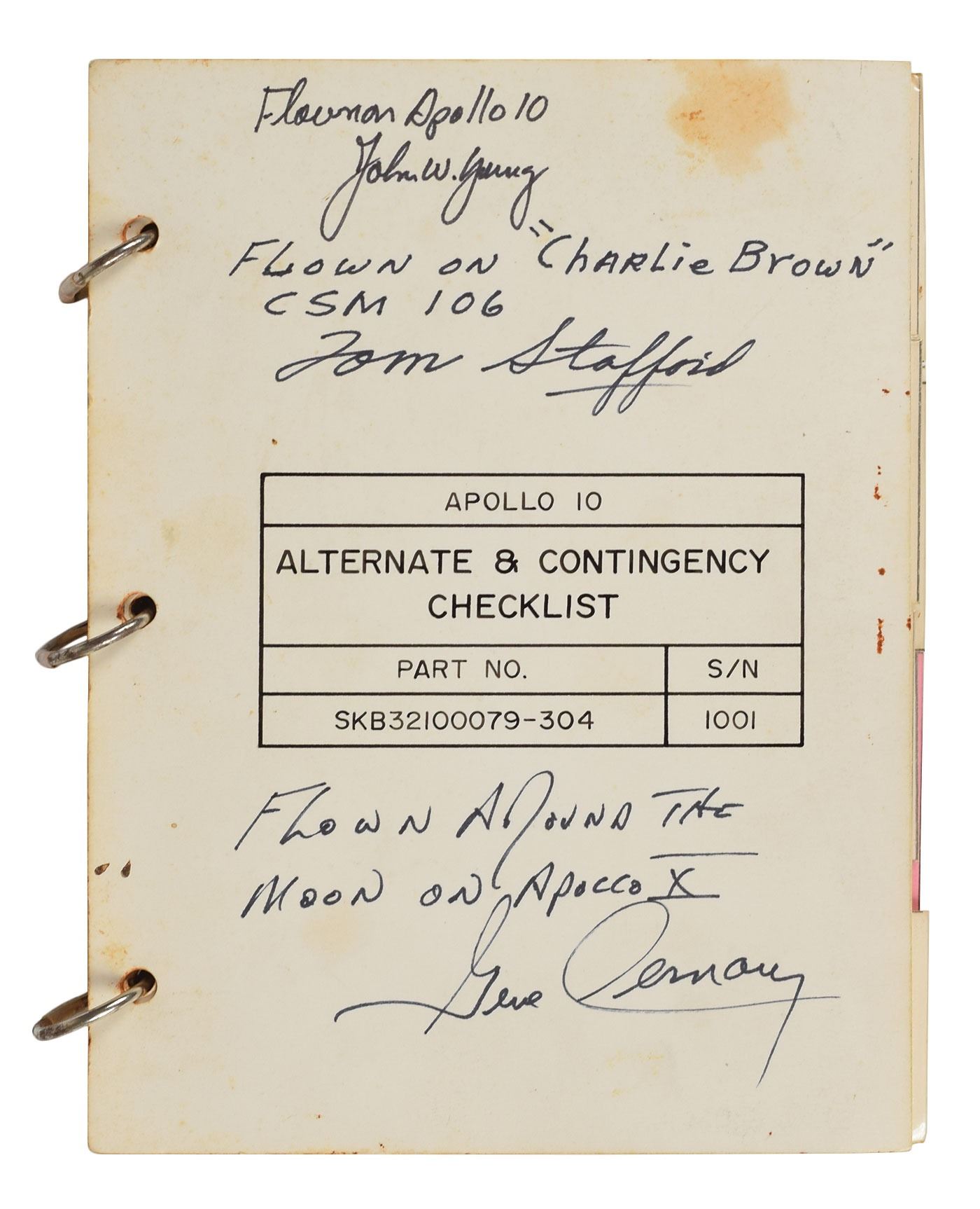 Exceptional complete ring-bound "Alternate & Contingency" checklist carried on the Apollo 10 mission, 6 x 8, 44 double-sided pages, signed and flight-certified on the front cover in black felt tip by the entire crew, "Flown on Apollo 10, John W. Young," "Flown on 'Charlie Brown,' CSM 106, Tom Stafford," and "Flown Around the Moon on Apollo X, Gene Cernan." The front cover reads: "Apollo 10, Alternate & Contingency Checklist, Part No. SKB32100079-304, S/N 1001." The covers are heavyweight cardstock boards, and the inner pages are a lighter cardstock. The checklist provides vital data and procedures to be used in the event of an emergency or unexpected situation, and is divided into several sections by plastic-coated tabs, including: "Nav Sighting," "Normal Deorbit," "Earth Orbit Entry," "Earth Landing," "Entry Emergency," "Contingency EVA," "SPS Tailoff," and various others. Several pages have brief handwritten notations, including notes on the Reaction Control System and a warning not to use water from the Command Module's supply to extinguish a fire. In fine condition, with a stain on the cover and expected wear from use.