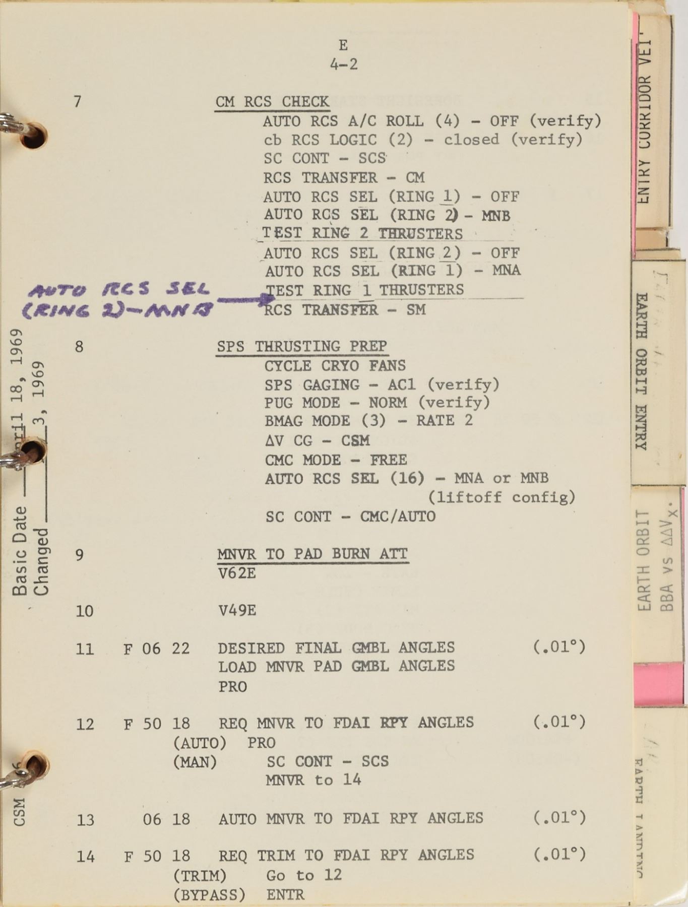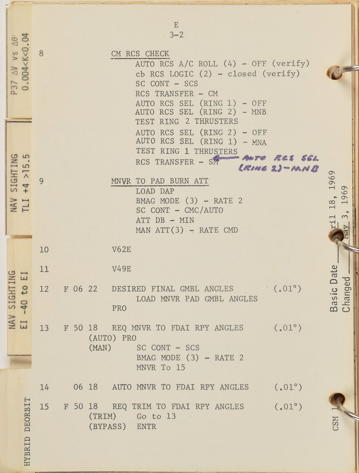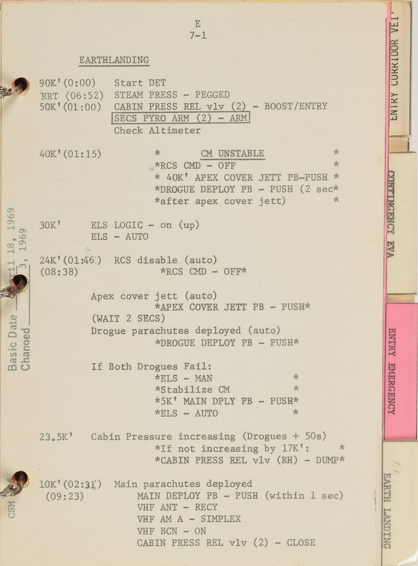 Exceptional complete ring-bound "Alternate & Contingency" checklist carried on the Apollo 10 mission, 6 x 8, 44 double-sided pages, signed and flight-certified on the front cover in black felt tip by the entire crew, "Flown on Apollo 10, John W. Young," "Flown on 'Charlie Brown,' CSM 106, Tom Stafford," and "Flown Around the Moon on Apollo X, Gene Cernan." The front cover reads: "Apollo 10, Alternate & Contingency Checklist, Part No. SKB32100079-304, S/N 1001." The covers are heavyweight cardstock boards, and the inner pages are a lighter cardstock. The checklist provides vital data and procedures to be used in the event of an emergency or unexpected situation, and is divided into several sections by plastic-coated tabs, including: "Nav Sighting," "Normal Deorbit," "Earth Orbit Entry," "Earth Landing," "Entry Emergency," "Contingency EVA," "SPS Tailoff," and various others. Several pages have brief handwritten notations, including notes on the Reaction Control System and a warning not to use water from the Command Module's supply to extinguish a fire. In fine condition, with a stain on the cover and expected wear from use.