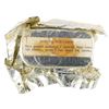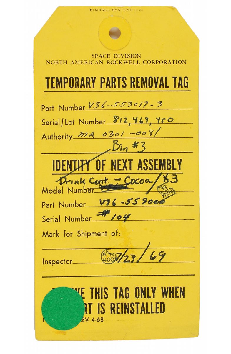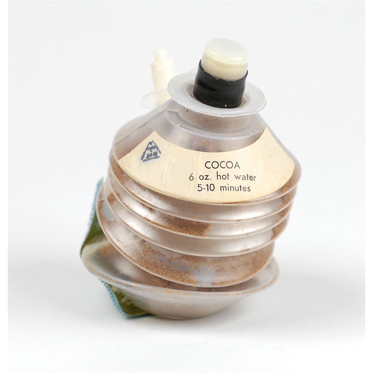 Flown accordion-style bottle of cocoa powder carried on Apollo 10, measuring approximately 2.5? in diameter and 3.5? tall, with labels affixed at the top reading, “Cocoa, 6 oz. hot water, 5-10 minutes” and “Serial No. FBK 450.” A blue Velcro swatch is affixed at the bottom. Includes the original North American Rockwell temporary parts removal tag noting this serial number as one of three cocoa bottles removed, in part: “Part Number V36-553017-3, Serial/Lot Number 812, 469, 450, Authority MA 0301-0081,” dated July 23, 1969. In fine condition. Accompanied by a pack of food vacuum-packed in silver foil, with a stained label reading: “Survival Food Packet. This packet contains 2 special food bars. Eat slowly, about 1/2 bar every 3-4 hours.” Flown food packs are rarely found with their original excess tags, making this well-documented piece particularly desirable.