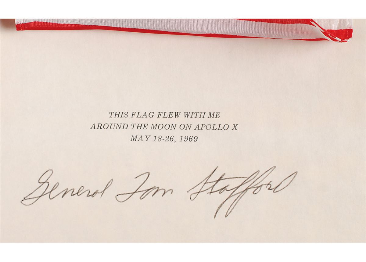 Flown American flag carried on the Apollo 10 mission, 5.75 x 4, affixed to a 11 x 8.5 presentation sheet with the text, “This flag flew with me around the moon on Apollo X, May 18–26, 1969,” signed below in black ballpoint, “General Tom Stafford.” Light creases and toning to the presentation sheet, and the flag covering the first line of printed text, otherwise fine condition.