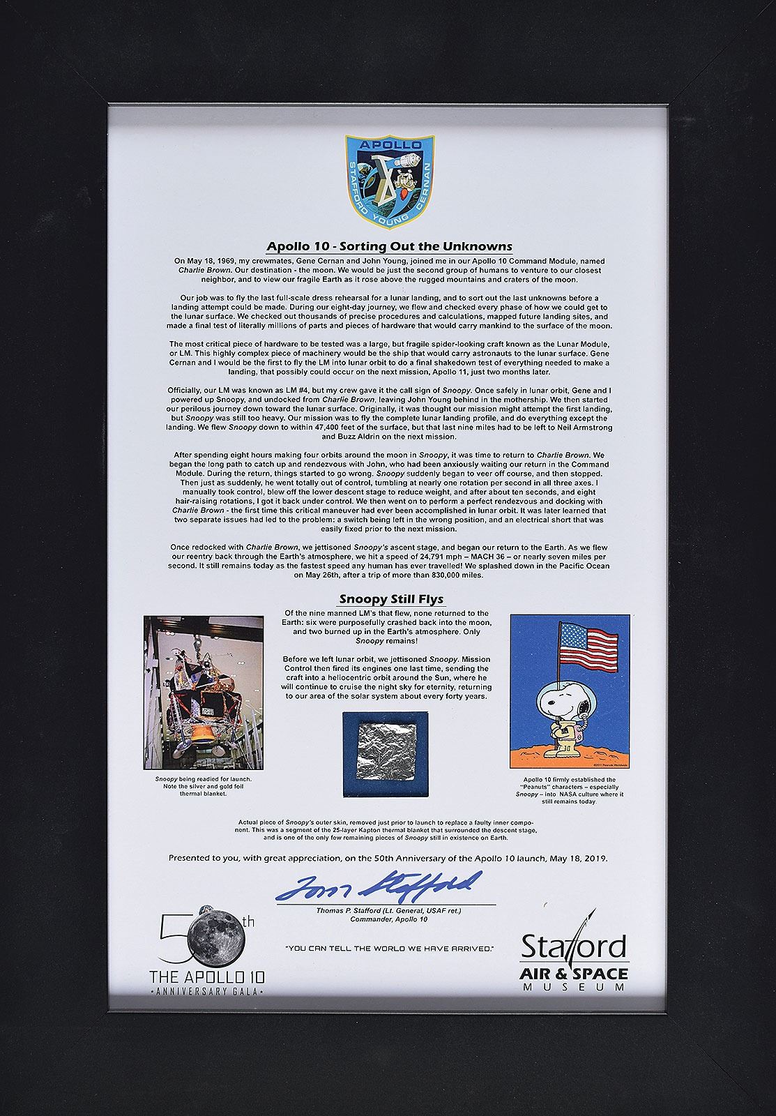 Scarce swatch of Kapton foil removed from the thermal blanket of the Lunar Module Snoopy prior to the launch of the Apollo 10 mission, measuring 1.5? x 1?, mounted and matted with a detailed certificate of authenticity signed in blue felt tip by Commander Tom Stafford, which reads, in part: "Of the nine manned LM's that flew, none returned to the Earth: six were purposefully crashed back into the moon, and two burned up in the Earth's atmosphere. Only Snoopy remains! Before we left lunar orbit, we jettisoned Snoopy. Mission Control then fired its engines one last time, sending the craft into a heliocentric orbit around the Sun where he will continue to cruise the night sky for eternity, returning to our area of the solar system about every forty years." The authenticity statement: "Actual piece of Snoopy's outer skin, removed just prior to launch to replace a faulty inner component. This was a segment of the 25-layer Kapton thermal blanket that surrounded the descent stage, and is one of the only few remaining pieces of Snoopy still in existence on Earth." Framed to an overall size of 13.75 x 19.75. In fine condition.