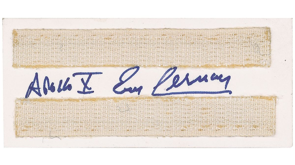 Accompanied by a 2007 letter of authenticity from Cernan, which reads, in part: “This is to certify that the accompanying Apollo 10 LM (Lunar Module) Docking Cue Card was flown into low lunar orbit in May 1969 aboard the lunar module ‘Snoopy’ on the second manned mission to the moon. The Lunar Module Docking Cue Card is one of the lunar module (LM) cue cards we carried to the moon on Apollo 10. This flown Apollo 10 Docking Cue Card is an example of cue cards that were used in the lunar module ‘Snoopy’ during the spacecraft’s low level orbital pass over the lunar surface…This LM cue card has remained a treasured part of my personal space collection for more than thirty-five years, ever since NASA presented it back to me in 1969…This complete Lunar Module Docking Cue Card remains both a historic tool from one of the manned lunar voyages, a rare example of an astronaut flight-certified artifact returned from the Moon.”