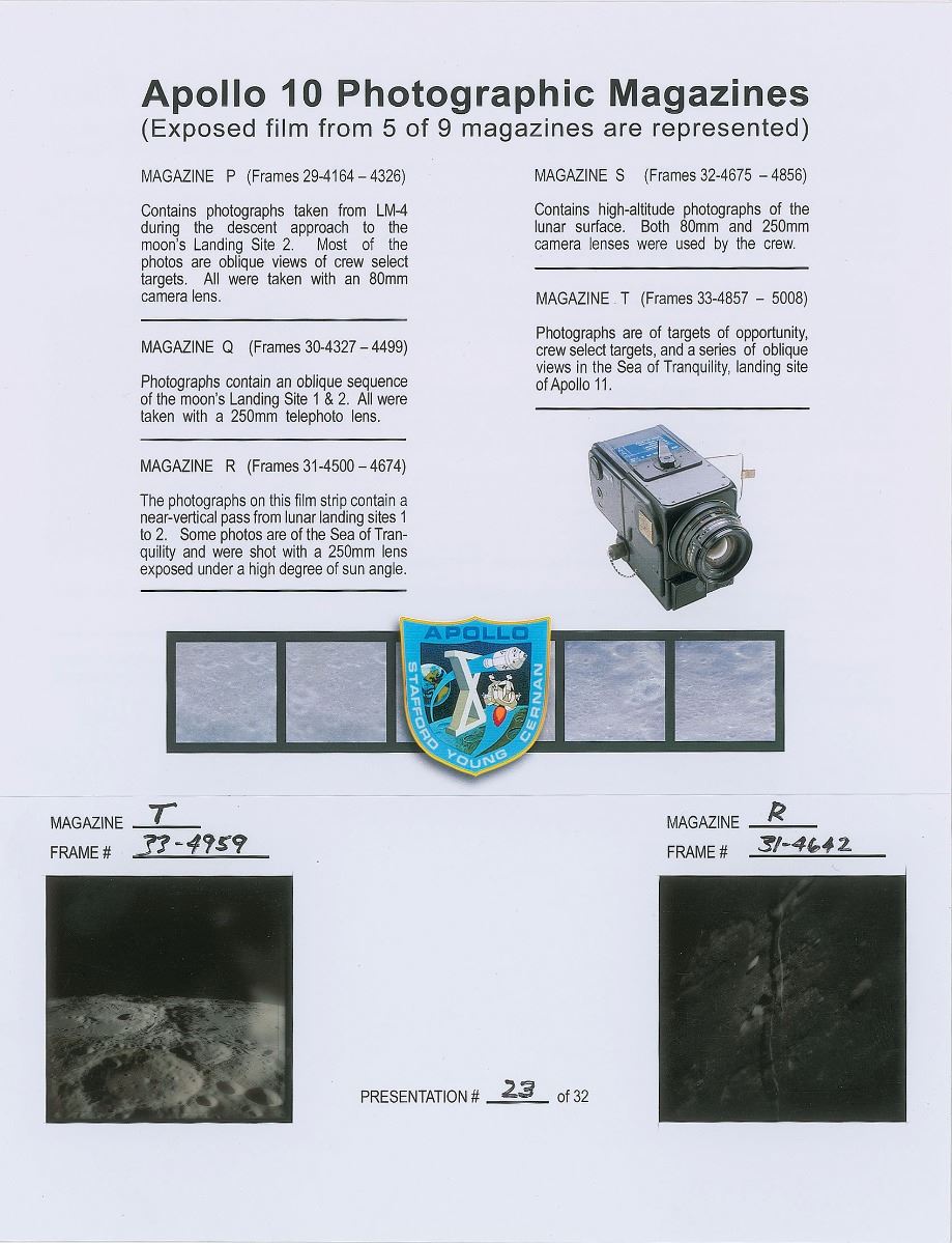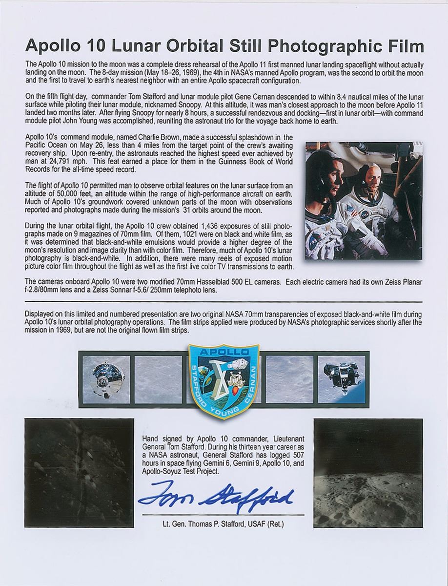 Incredible limited edition presentation of two original NASA 70mm transparencies of black-and-white film exposed during Apollo 10’s lunar orbital photography operations, unflown but produced from the original film by NASA’s photographic services shortly after the mission in 1969. Mounted inside an 8.5 x 11 certificate, numbered 23/32, signed at the bottom in blue felt tip by Commander Tom Stafford. The sheet provides a description of the mission and explanation of the photography, noting that the astronauts took 1,436 frames of still photographs during the mission using nine rolls of film. One transparency is labeled “Magazine T, Frame # 33-4959,” and shows an oblique view of the craters found within the Sea of Tranquility, with the the pitch-black horizon seen in the background. The other, labeled “Magazine R, Frame # 31-4642,” shows an overhead view of the cratered lunar surface. In fine condition. An exceptional piece featuring two original NASA transparencies of the lunar surface as seen from the second Apollo mission to orbit the moon. From the collection of aerospace memorabilia specialist Ken Havekotte.