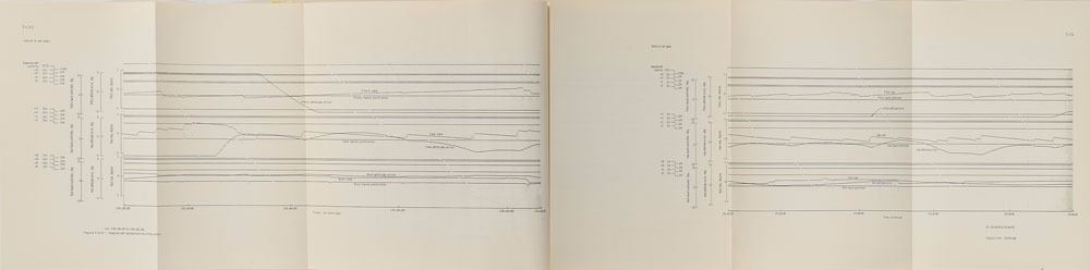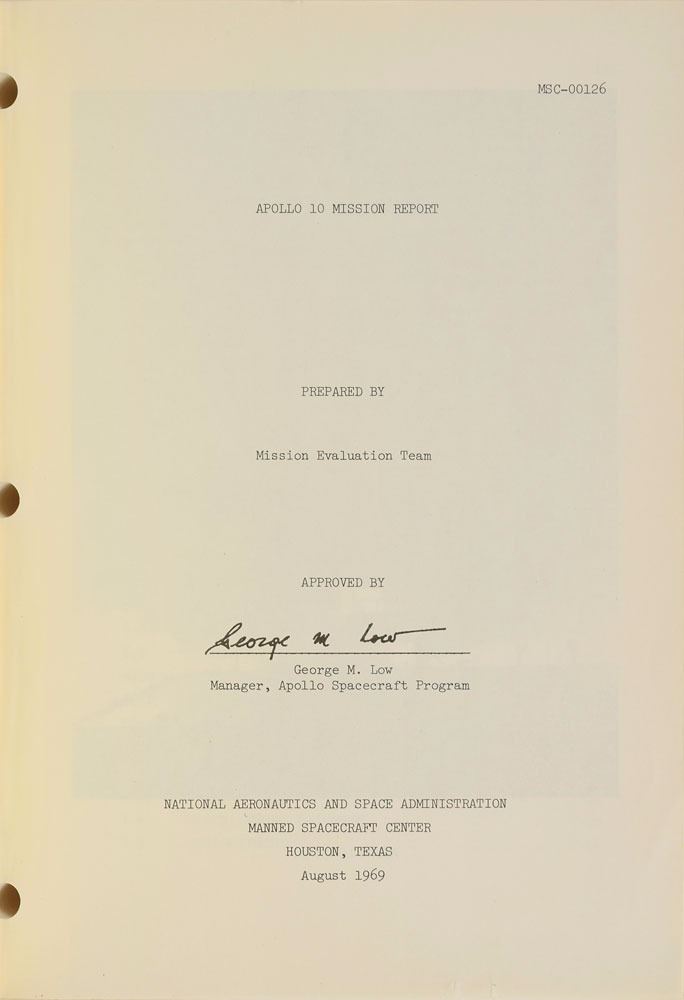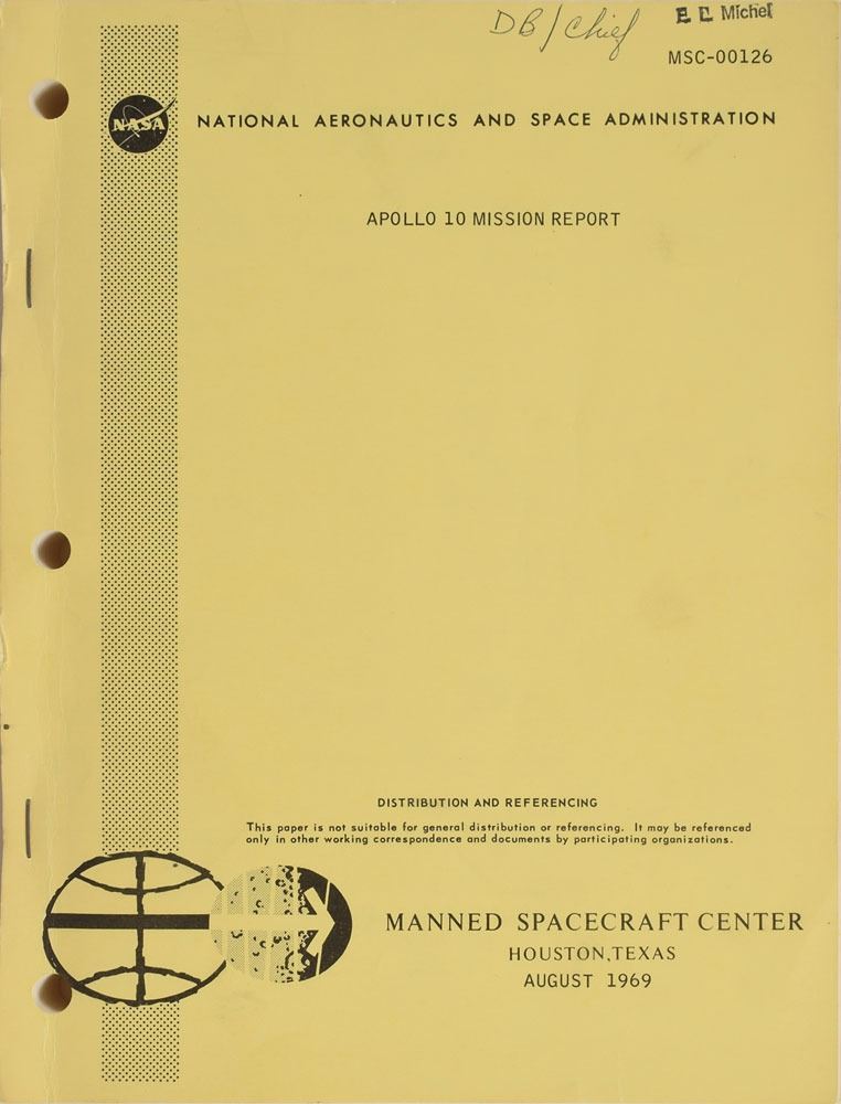 Staple-bound manual entitled "Apollo 10 Mission Report," MSC-00126, 8 x 10.5, approximately 300 pages, dated August 1969. The report provides details on the ‘dress rehearsal’ for the eventual Apollo 11 moon-landing, and includes thorough information on flight trajectories, performance by the command/service module and lunar module, in-flight science and photography, the equipment used on the mission, and overall evaluations. It features several pullout charts. The name "E. L. Michel," who worked in NASA's medical offices, is stamped in the upper right corner of the cover. In fine condition, with some creases and marks to covers.