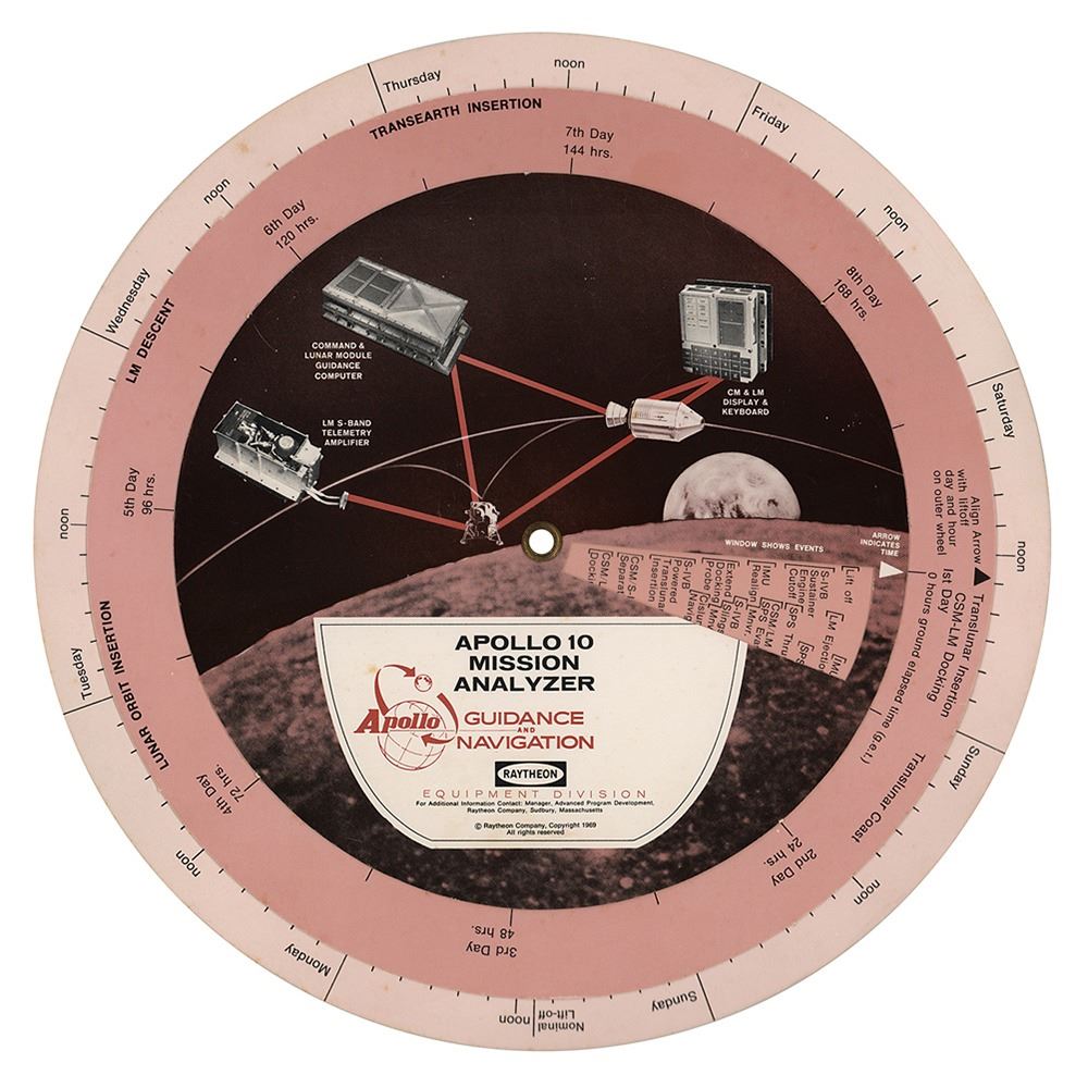 A double-sided circular cardstock "Apollo 10 Mission Analyzer" rotating chart made by Raytheon in 1969, measuring 9.5‰Û_ in diameter, providing a guide for the mission's timeline and activities. In fine condition, with light scattered toning.