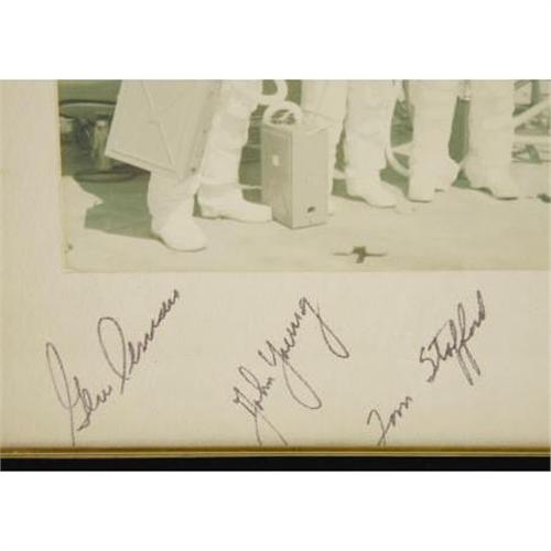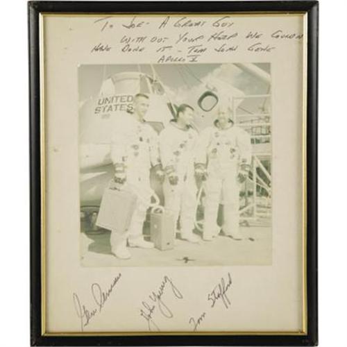 <B>Apollo 10 Signed Color Crew Photograph,</B></I> 6.75" x 7", matted to 9" x 11, framed to 10" x 12". Inscribed "<I>To Joe - A Great Guy/ Without Your Help we Couldn't/ Have Done It - Tom John Gene/ Apollo X/ Gene Cernan,</B></I>" also signed "<I>John Young</B></I>" and "<I>Tom Stafford.</B></I>" Photo lightly faded. With all its mission objectives achieved, Apollo 10 set the stage for the first manned moon landing just two months later. <I>From the collection of renowned former physical trainer of the astronauts Joe Garino. This lot is accompanied by a signed certificate of authentication from Garino verifying its provenance.</B></I><BR><BR><b>Shipping:</b> Framed - with Glass, Small (<a target="_blank" href="http://www.heritageauctions.com/common/shipping.php">view shipping information</a>)