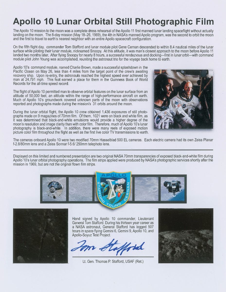Two items: a hard-to-find launch day postcard featuring the Apollo 10 mission insignia and a Cape Canaveral launch day postmark, signed in black felt tip by John Young, Gene Cernan, and Tom Stafford; and a limited edition presentation of two original NASA 70mm transparencies of black-and-white film exposed during Apollo 10’s lunar orbital photography operations, unflown but produced from the original film by NASA’s photographic services shortly after the mission in 1969, mounted inside an 8.5 x 11 certificate, numbered 9/32, signed at the bottom in blue felt tip by Commander Tom Stafford. In overall fine condition. Accompanied by an Apollo 10 ‘minilog’ pamphlet and an annotated schematic of the LM-4 control/display panels. Consignor notes that these launch day postcards were issued on-site by KSC-NASA to guests viewing the launch. From the collection of aerospace memorabilia specialist Ken Havekotte.