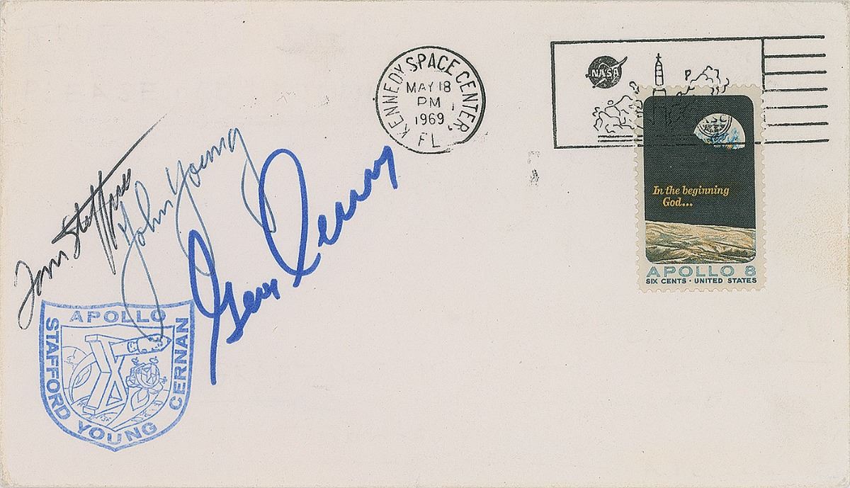 Launch day postal cover with a stamped cachet of the Apollo 10 mission insignia, postmarked Kennedy Space Center, May 18, 1969, signed in black ballpoint by Tom Stafford and John Young, and in blue felt tip by Gene Cernan. In fine condition.