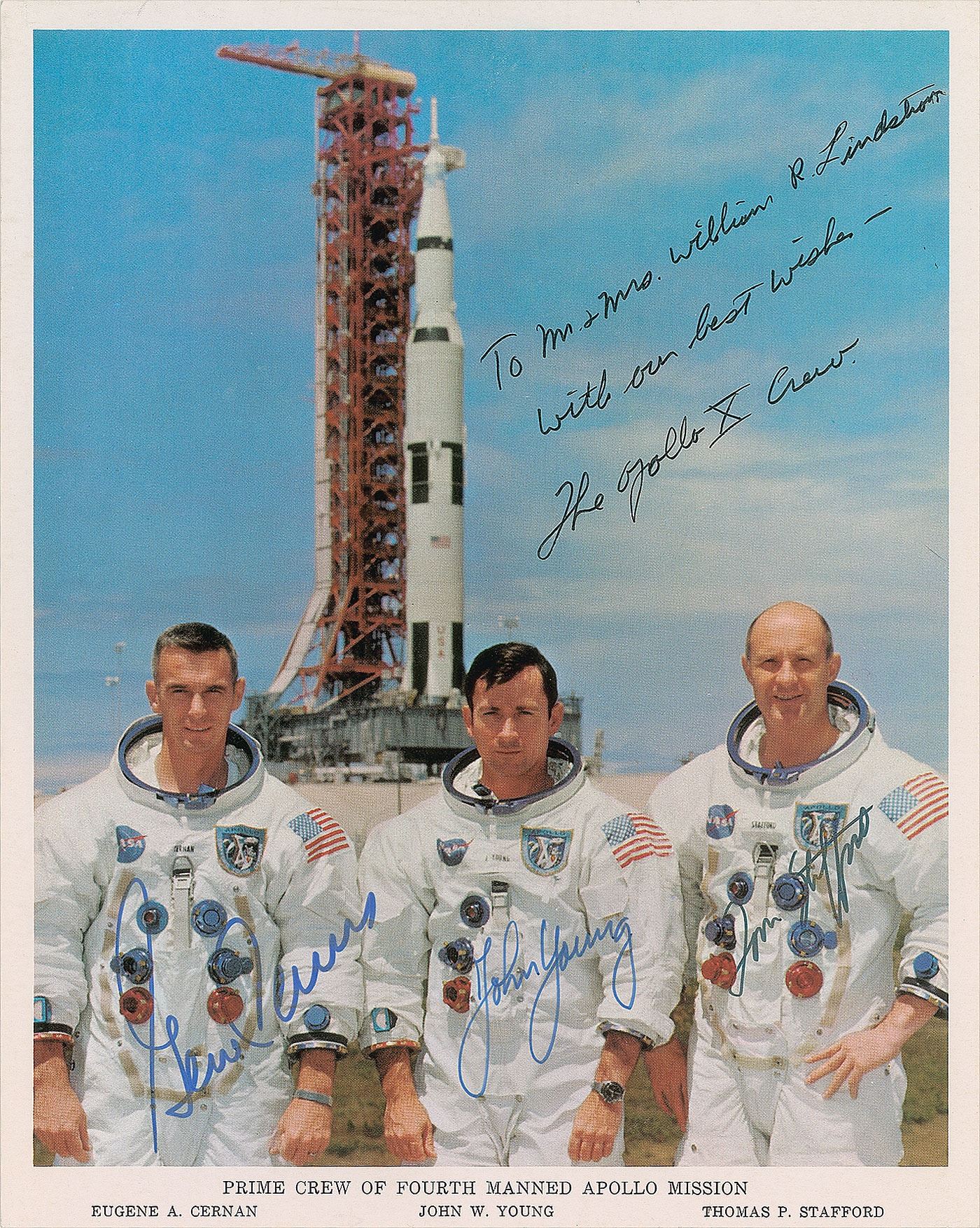 Official color 8 x 10 NASA lithograph of the Apollo 10 crew in their white space suits with the Saturn V rocket in the background, signed and inscribed in black felt tip, "To Mr. & Mrs. William R. Lindstrom, with our best wishes—The Apollo X Crew, Tom Stafford,” and in blue felt tip, "John Young" and "Gene Cernan." In fine condition. From the collection of aerospace memorabilia specialist Ken Havekotte.