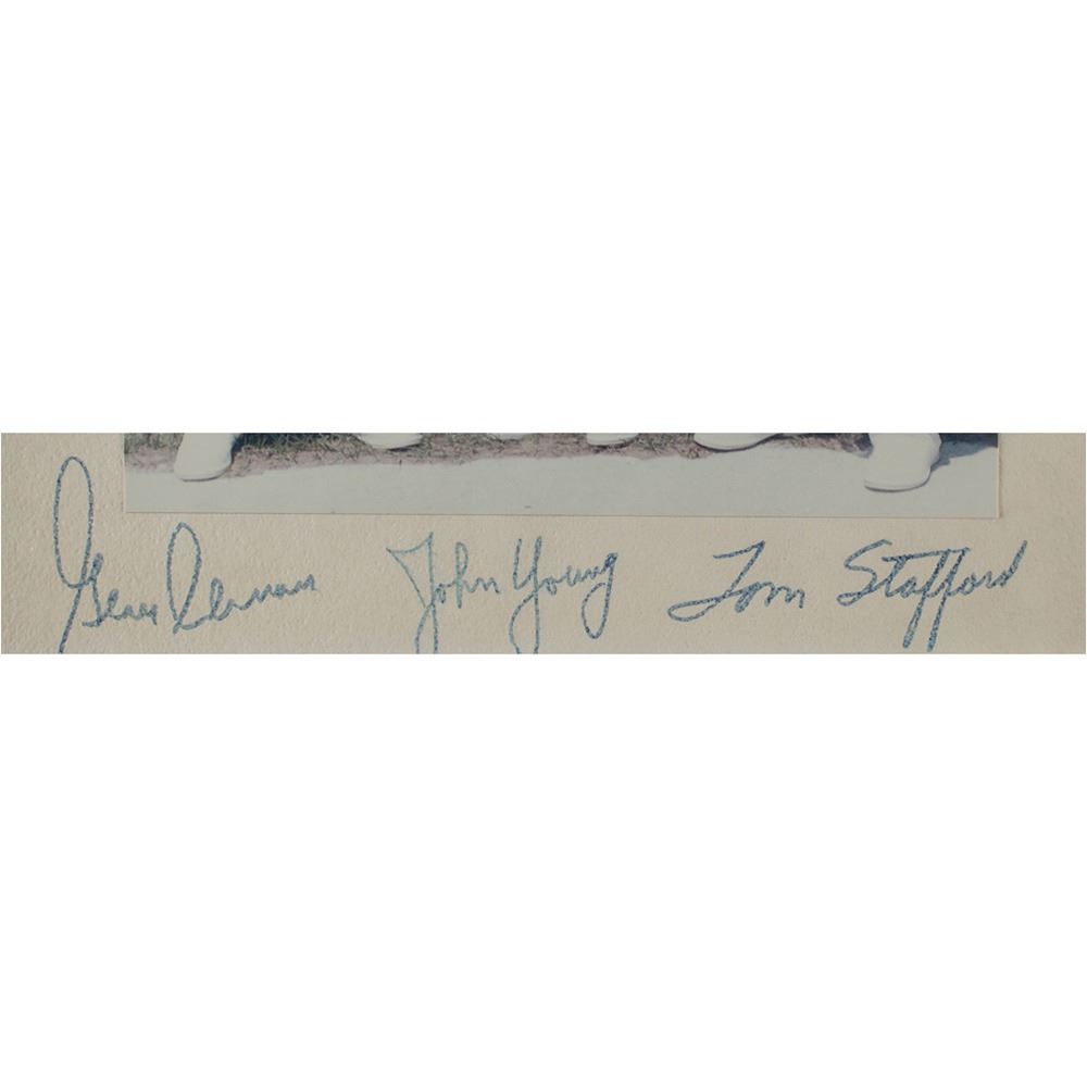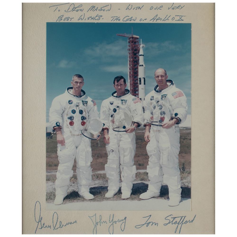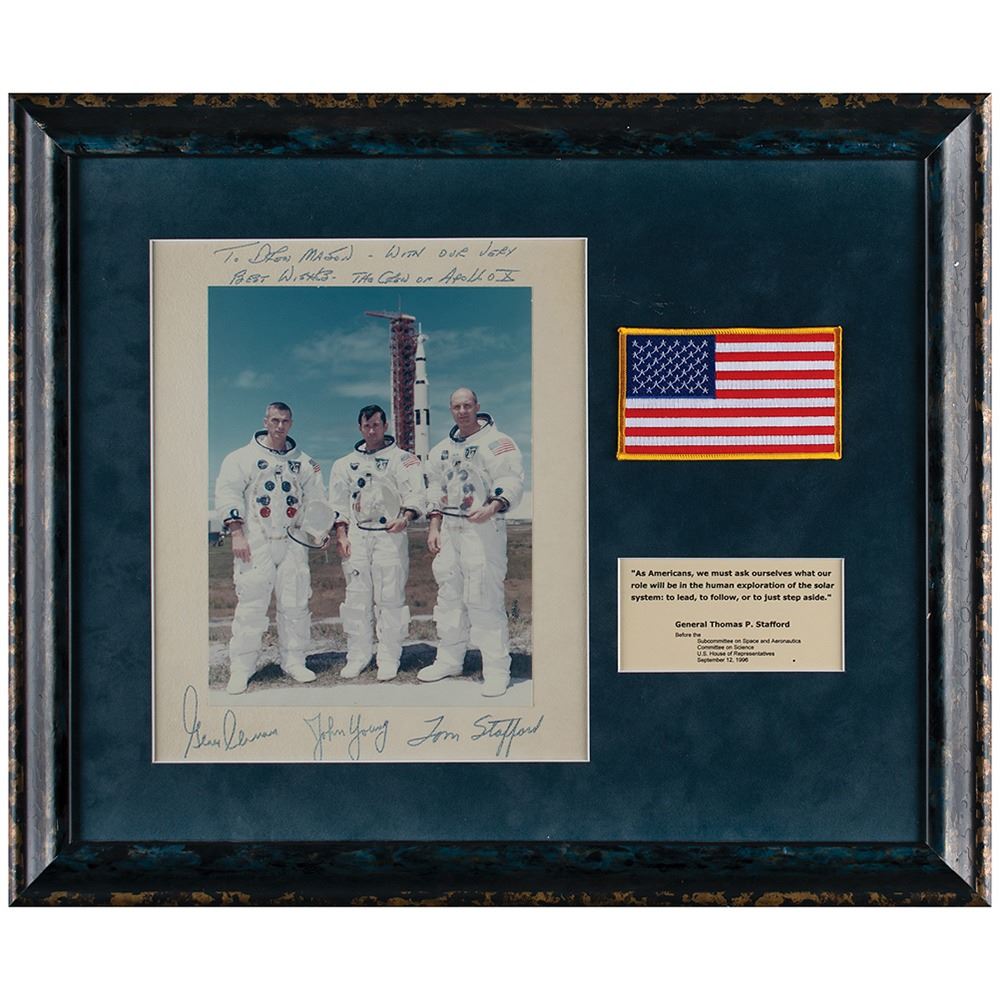 Official color semi-glossy 7.25 x 9.5 photo of the Apollo 10 crew posing in their white space suits in front of the Saturn rocket that will send them to the moon, signed and inscribed on the mount in black felt tip, "To Drew Mason-with our very best wishes-the crew of Apollo X, Gene Cernan" and "Tom Stafford." The John Young signature is a proxy example. Matted and framed with a caption and American flag patch to an overall size of 22.25 x 18.5. In fine condition.