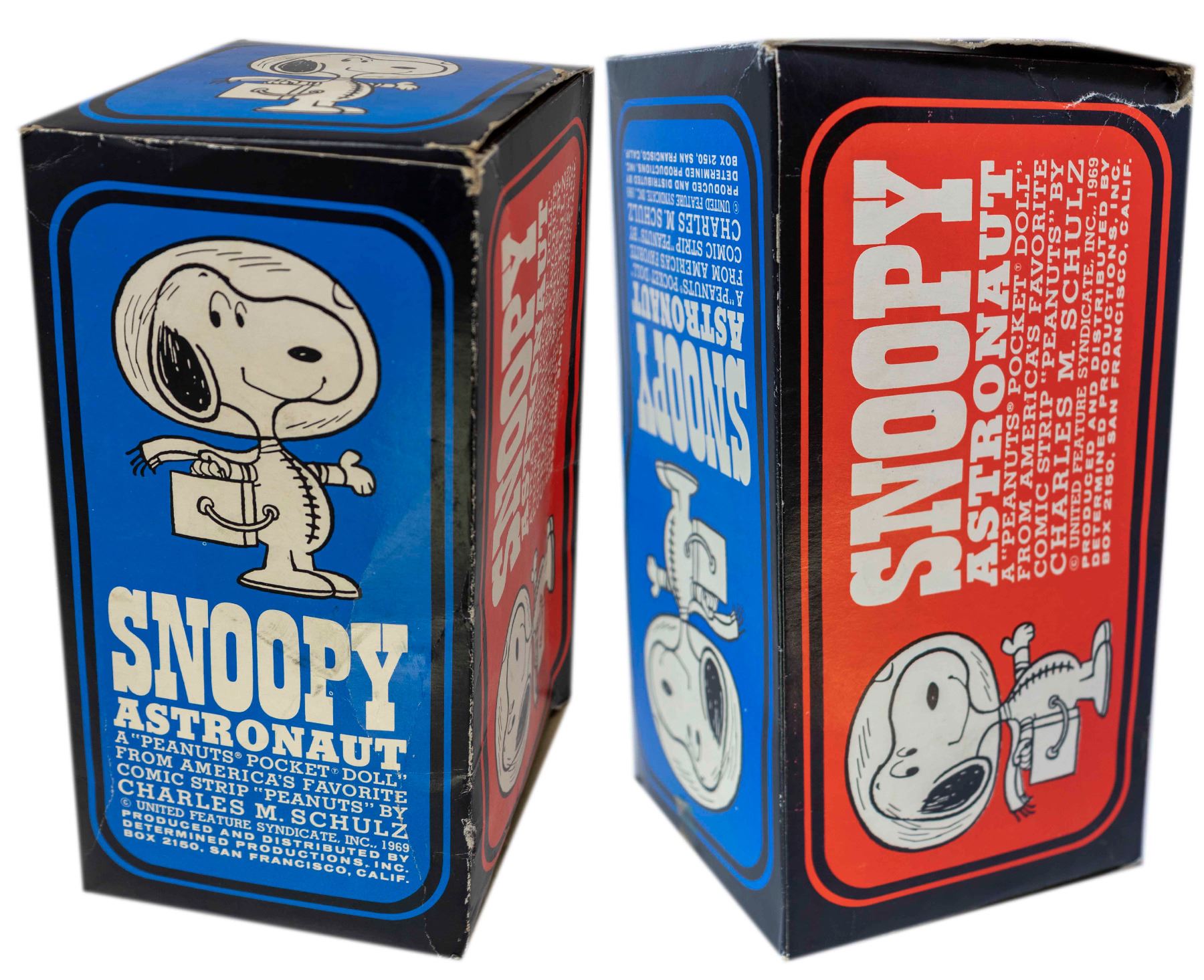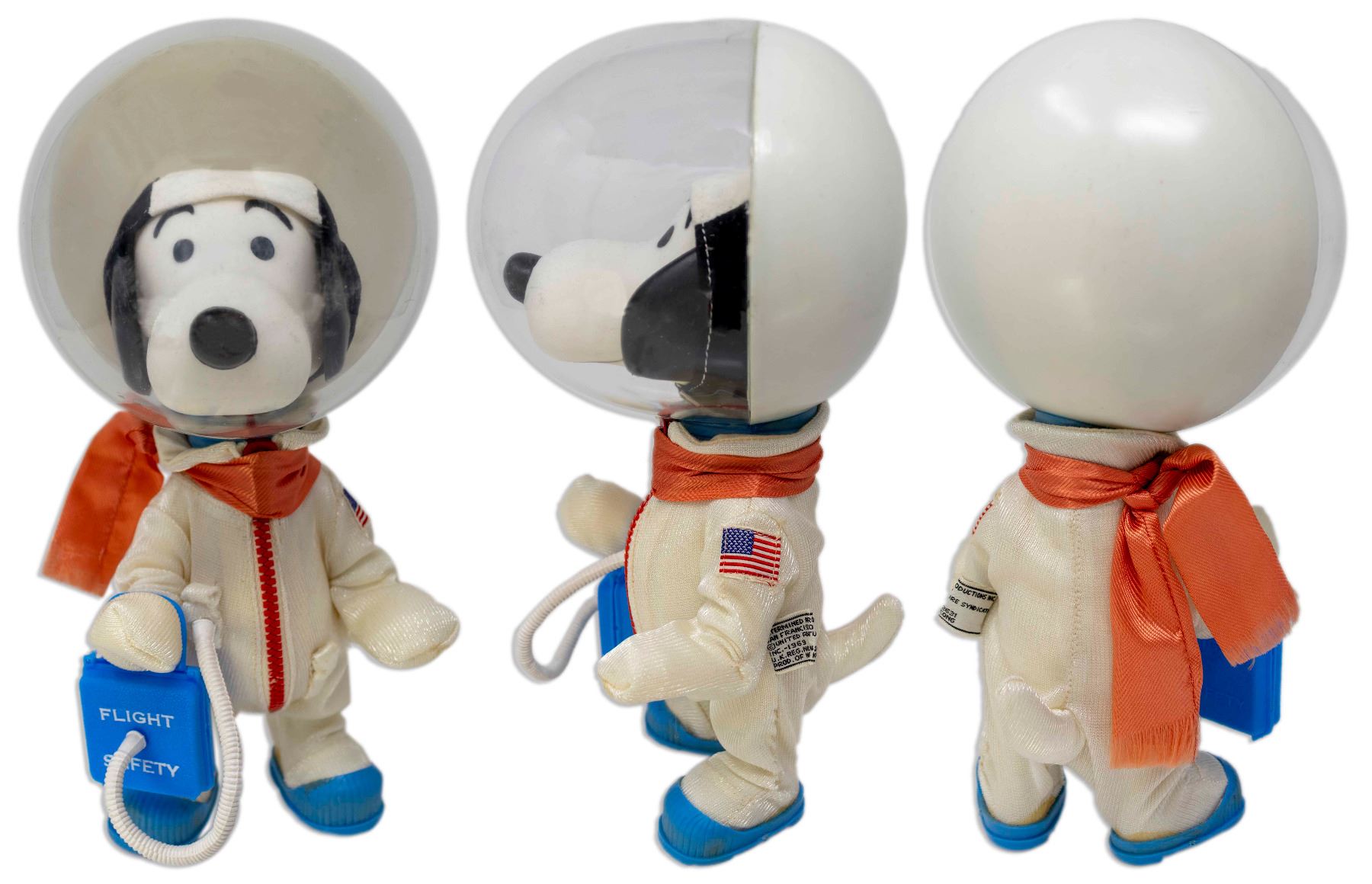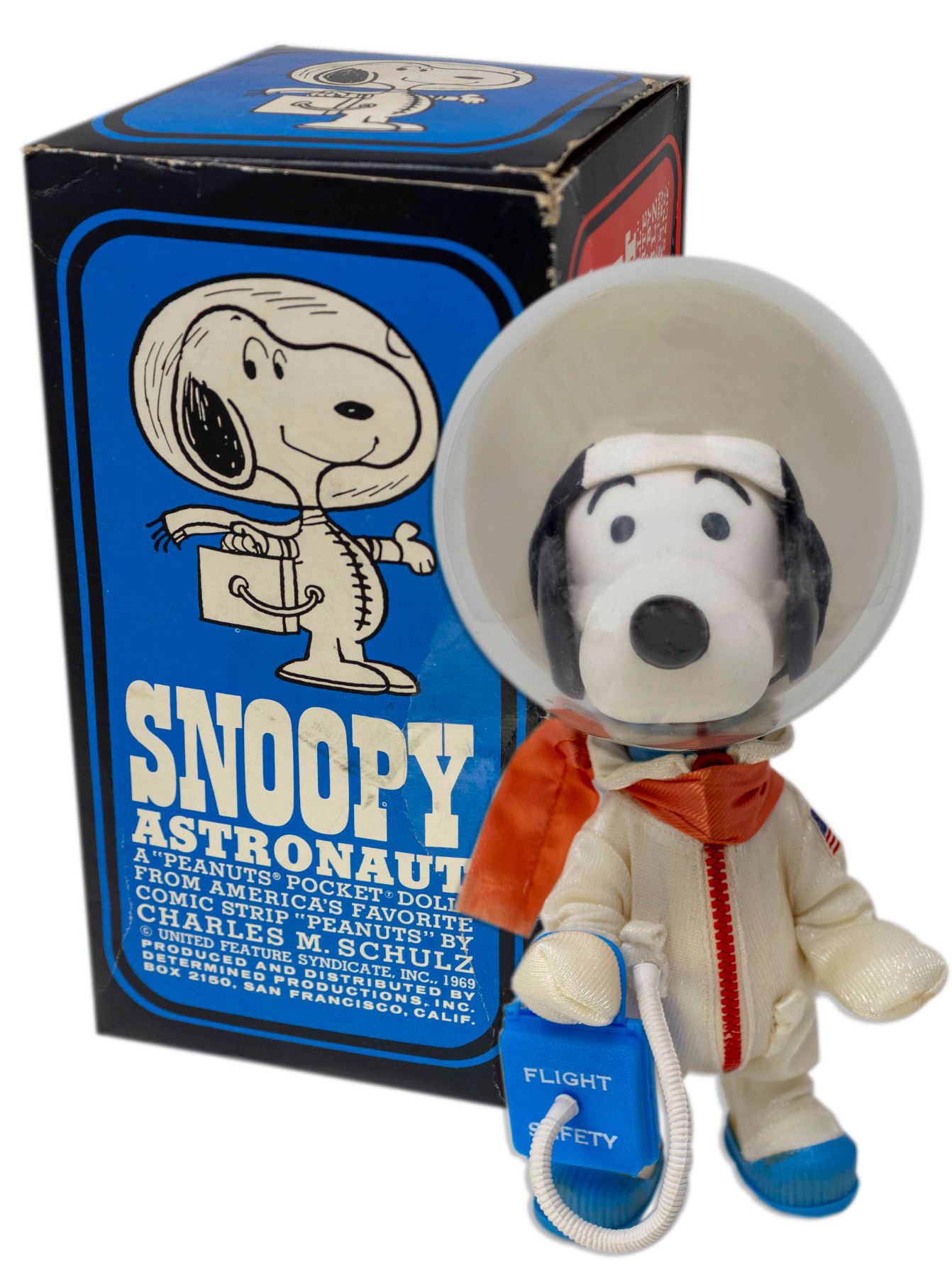 ''Snoopy Astronaut'' toy from 1969, made in conjunction with the Apollo 10 mission in May of that year. Snoopy is outfitted in an astronaut's white space suit with a U.S. flag on his arm, and holding a ''Flight Safety'' suitcase. He measures 9'' tall x approximately 4.5'' wide at his head. With original box measuring 4.75'' x 4.75'' x 9.25''. In unusually well-preserved, near fine condition.
