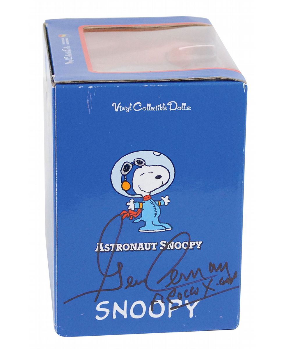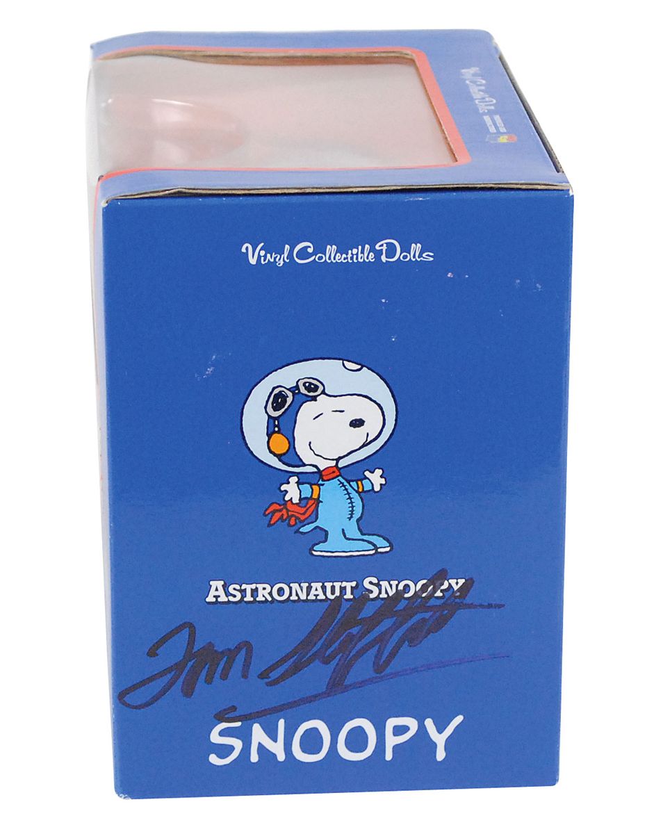 Vinyl ‘Astronaut Snoopy’ doll toy in its original 6 x 6.25 x 4.5 box, signed on either side of the box in black felt tip, “Tom Stafford” and “Gene Cernan.” In fine condition.