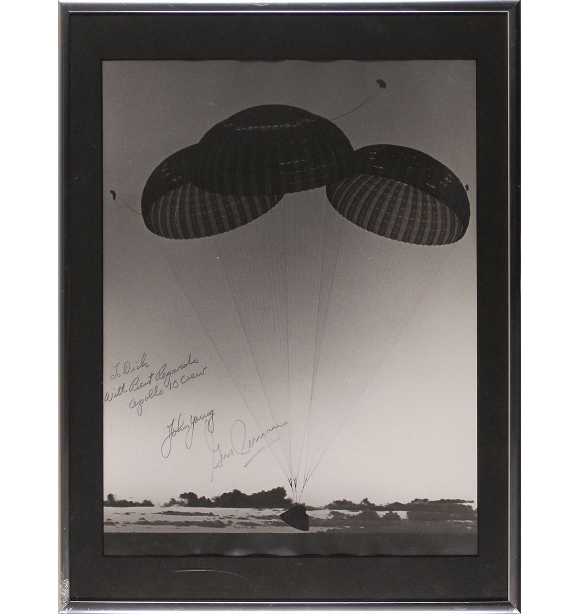 Vintage matte-finish 10 x 13.25 photo of the Apollo 10 capsule shortly before splashdown, signed and inscribed in black felt tip, “To Dick, with best regards, Apollo 10 crew, John Young,” and “Gene Cernan.” Matted and framed to an overall size of 12.5 x 16.5. Scattered light creases and ripples, otherwise fine condition.