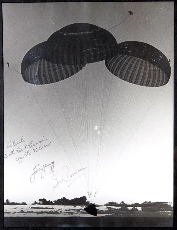 Apollo 10 Crew Signed Photo. A beautiful B&W photo of the Apollo 10 Command Module photographed, under 3 fully deployed parachutes, as it nears splash down in the Pacific Ocean. The photo is autographed by John Young and Gene Cernan and inscribed "To Dick With Best Regards, Apollo 10 Crew". Framed in silver with a black matt the piece measures 12 x 16½". Michael enjoyed this photo in his office for many years. Ex. the Michael Orenstein Estate Collection.