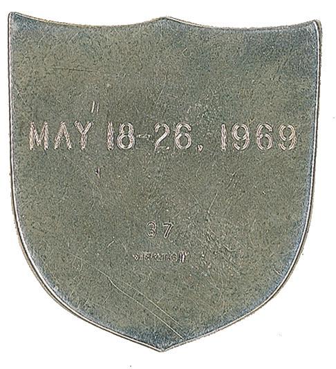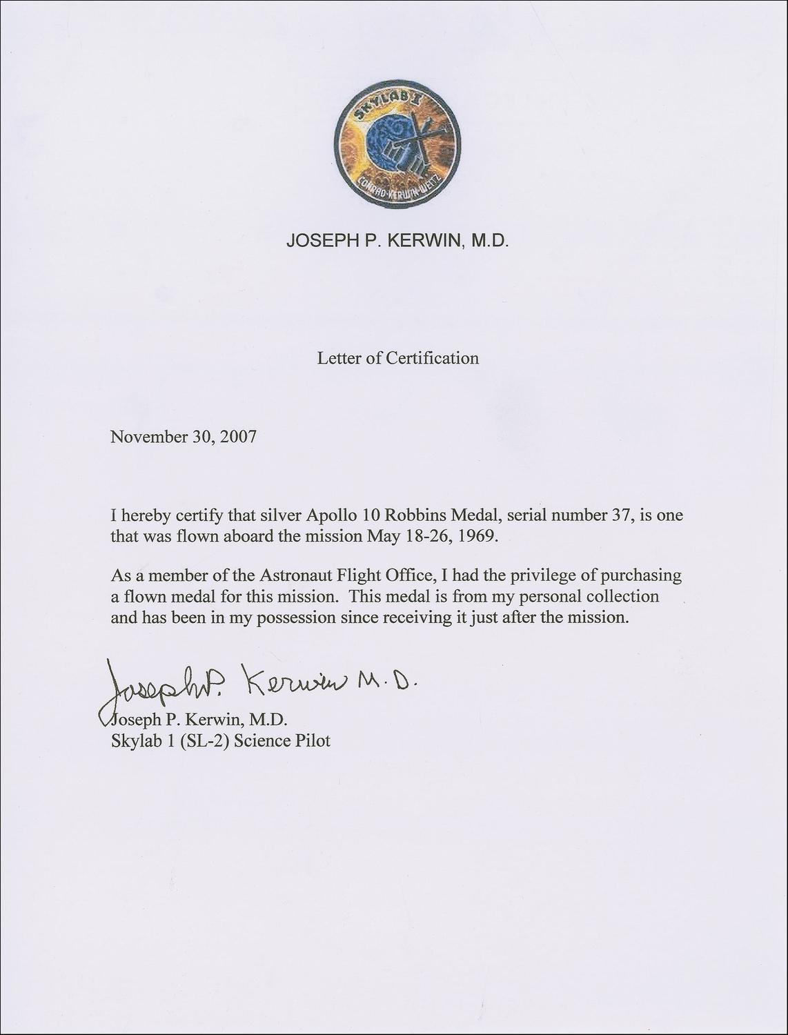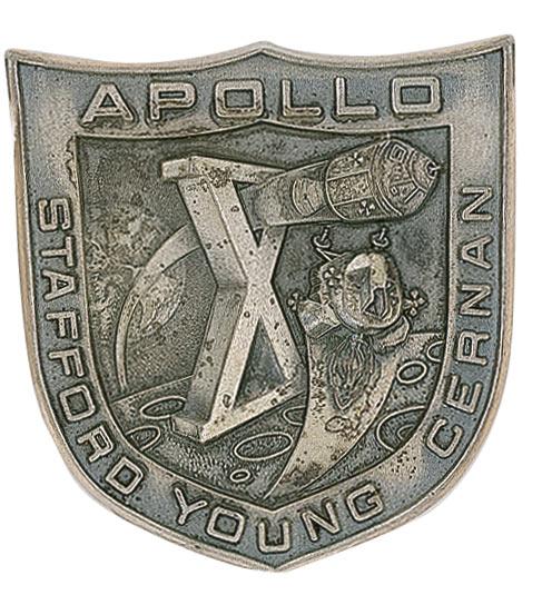Flight-flown Apollo 10 Robbins Medal, approximately 1.25 x 1.25, with a raised design on the face of the mission insignia and the last names of crew members Tom Stafford, John Young, and Gene Cernan. The reverse of the sterling silver medal is engraved “May 18–26, 1969” and serial numbered “37.” Normal condition. Made by the Robbins Company of Attleboro, Massachusetts, astronauts who are in line for a flight have the option of purchasing the medallions for themselves, family, and friends as personal souvenirs. The medals are made available only to the astronauts. At the conclusion of a flight, the tokens are sent back to Robbins, where they are engraved on the reverse, polished, numbered, and returned to the astronauts. The dyes are later destroyed. Remarkably scarce flight-flown mementos such as this rarely find their way to the marketplace. Accompanied by a letter of authenticity from Joseph P. Kerwin, who at the time was a member of the Astronaut Flight Office and later was science pilot onboard Skylab 2.