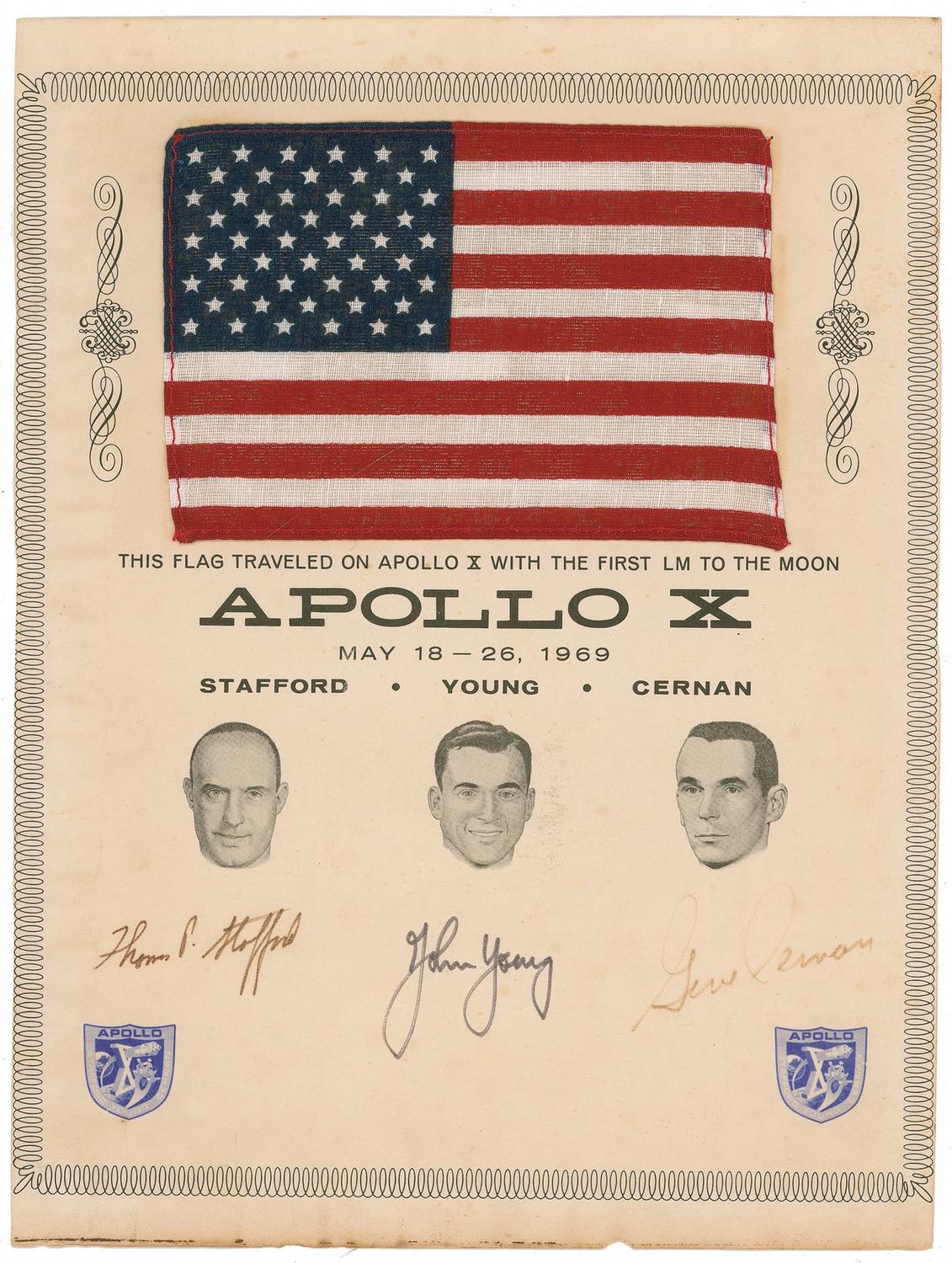 Flight-flown printed fabric American flag, 6 x 4, flown aboard Apollo 10 during its orbit around the moon. Flag is affixed by its corners to a 9 x 12 certificate stating “This flag traveled on Apollo X with the first LM to the moon,” and signed in black felt tip by crew members Tom Stafford, John Young, and Gene Cernan. In fine condition, with a trimmed edges to certificate, tiny chip in the paper, small strip of staining at the very bottom of the page, and Cernan’s signature a shade light. The edges can be easily matted out if desired. During Apollo 10, the lunar module was taken to within ten miles of the moon’s surface. With all its mission objectives achieved, Apollo 10, with this flag aboard, set the stage for the first manned moon landing just two months later.