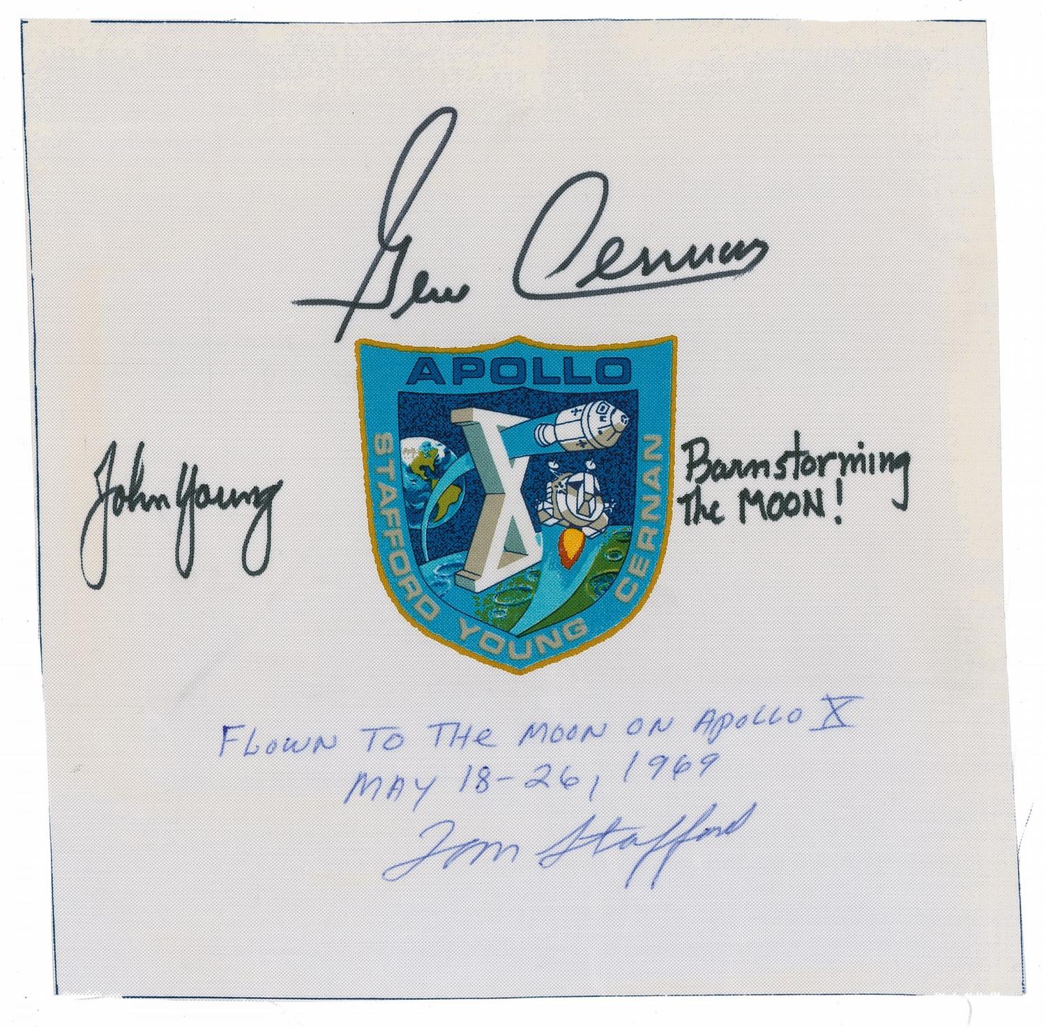 Large and visually striking flight-flown 9 x 9 swatch of Beta cloth, with a 3” diameter Apollo 10 mission emblem in the center, signed in black felt tip, “Gene Cernan” and “John Young, Barnstorming the Moon!” and in blue ballpoint, “Flown to the Moon on Apollo X. May 18-26, 1969. Tom Stafford.” In fine condition, with faint show-through of yellowing on the reverse touching the first letter of Young’s name. Young’s inscription is a reference to a Life magazine cover story on the ‘dress rehearsal’ flight for the upcoming moon landing. Ironically, the mission almost ended in tragedy as Cernan and Stafford momentarily lost control of the lunar module while coming within a few miles of the moon’s surface. Wonderful relic from the last Apollo mission before the historic Apollo 11 moon landing.