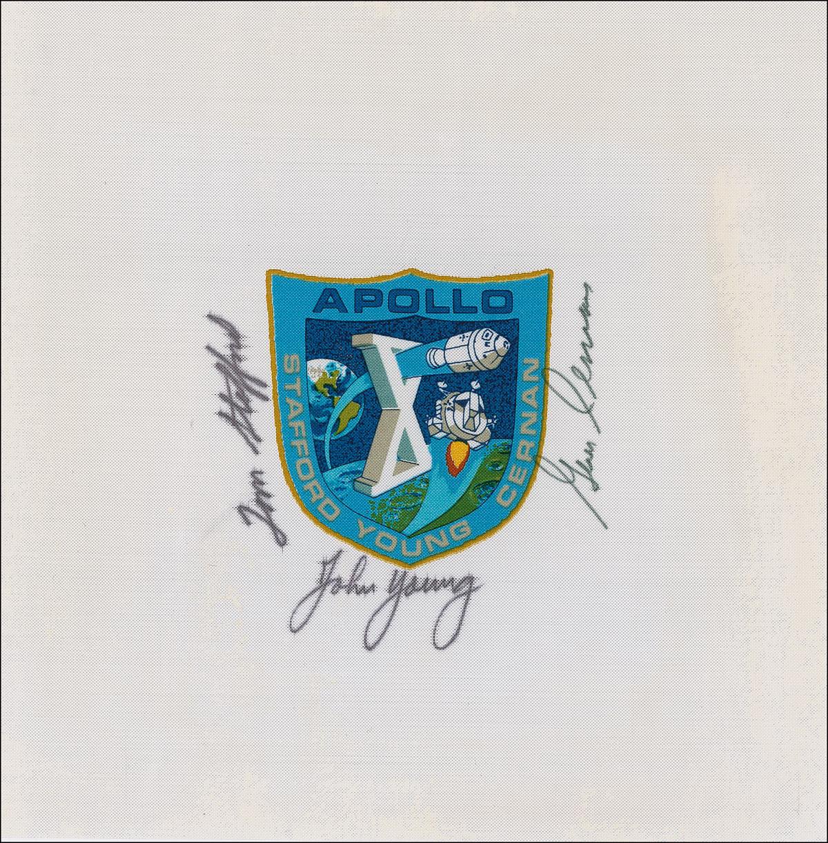 An 8.5 x 8.75 swatch of Beta cloth with the Apollo 10 emblem printed in the center, signed around the emblem in black felt tip by crew members Tom Stafford, Gene Cernan, and John Young. In fine condition, with some scattered light toning from adhesive remnants on reverse, and a bit of light feathering to Stafford’s and Young’s signatures due to nature of material. Accompanied by a certificate of authenticity from Novaspace for Young’s signature.
