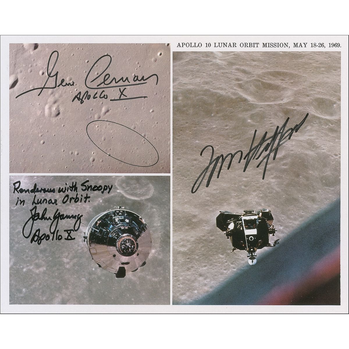 Color 10 x 8 NASA composite photo of the Apollo 10 mission, signed in black felt tip, “Gene Cernan, Apollo X,” “Rendezvous with Snoopy in Lunar Orbit, John Young, Apollo X,” and “Tom Stafford.” In fine condition. Accompanied by two certificates of authenticity from NovaSpace, one for Cernan and the other for Young. The three images featured have captured the southwest portion of the Sea of Tranquility on the lunar nearside, showing the areas of the Apollo Landing Site 2, the Command and Service Modules, and the ascent stage of the Lunar Module. A beautiful assemblage featuring exceptionally bold and crisp signatures from all three.