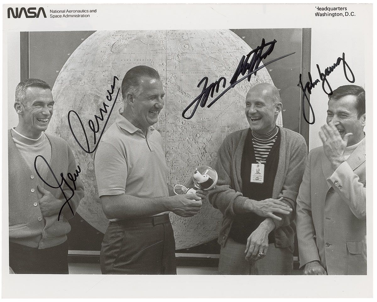 Vintage glossy 10 x 8 NASA photo of the Apollo 10 crew presenting a Snoopy astronaut doll to Vice President Spiro Agnew, signed later in the presence of the consignor in black felt tip by Gene Cernan, Tom Stafford, and John Young. In fine condition.