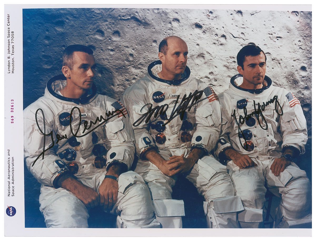 Crisp color glossy 10 x 8 second-generation ‘red-numbered’ NASA photo of the three crew members, suited and seated before a lunar backdrop, signed in black felt tip by Gene Cernan, Tom Stafford, and John Young. In fine condition, with some mild rubbing and irregular ink adhesion to the NASA print on the reverse.