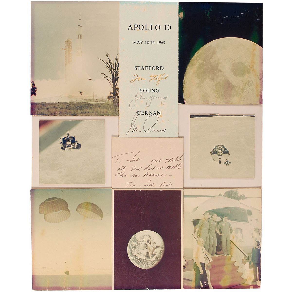Unique photograph montage of seven color photographs of the Apollo X mission, 4.5 x 4.25 to 6 x 8, matted with a 4 x 9.25 card signed “Tom Stafford,” “John Young,” and “Gene Cernan.” Matted with a 5 x 3.5 card bearing a note handwritten by Cernan, “To ‘Joe’ Our thanks for your help in making this all possible—Tom–John–Gene.” Cernan has written all three names. All of the pieces are affixed to a piece of cardboard to an overall size of 16 x 20. In good to very good condition, with the card toned, affecting the signatures, and the photos are slightly faded, soiled, and creased. Young and Cernan later walked on the moon.