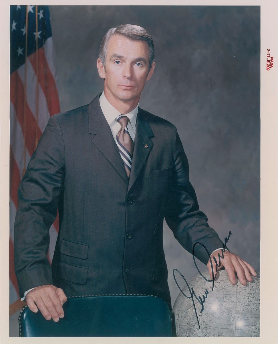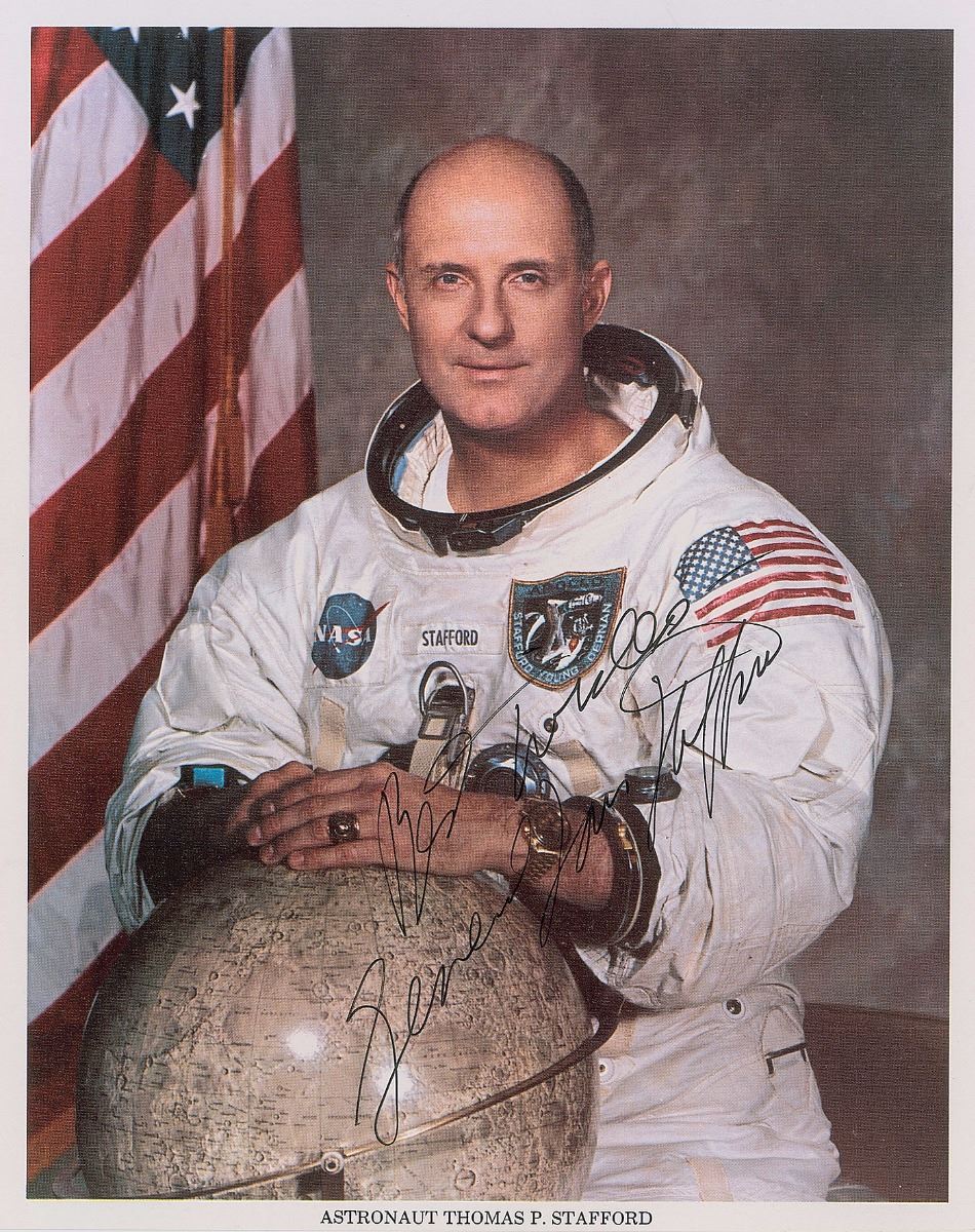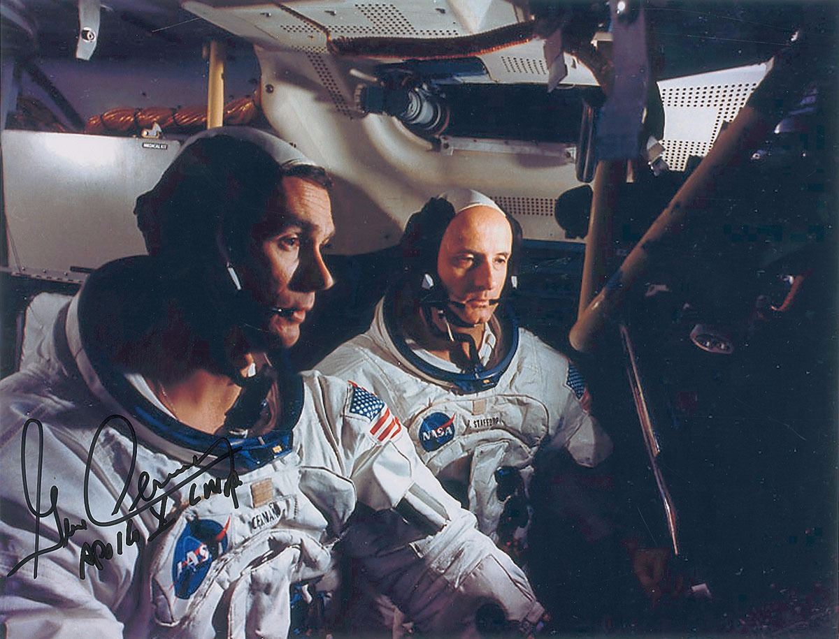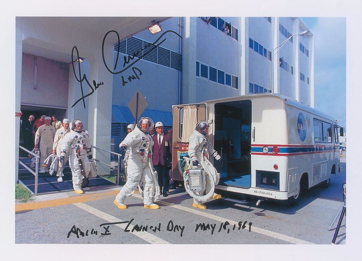 Set of four color photos showing crew members of Apollo 10, including two official NASA portraits, ranging in size from 8 x 10 to 10.5 x 7.5, three are signed in black felt tip by Gene Cernan, and one in black ink by Tom Stafford. In overall fine condition. Accompanied by a certificate of authenticity from Gene Cernan’s ‘Garage Sale’ through Novaspace. The Leon Ford Collection.