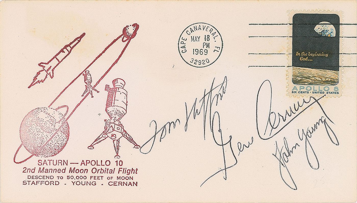 Launch day postal cover with a stamped cachet honoring the Apollo 10 mission, the second manned moon orbital flight, postmarked May 18, 1969, signed in black ballpoint by Tom Stafford, Gene Cernan, and John Young. In fine condition.