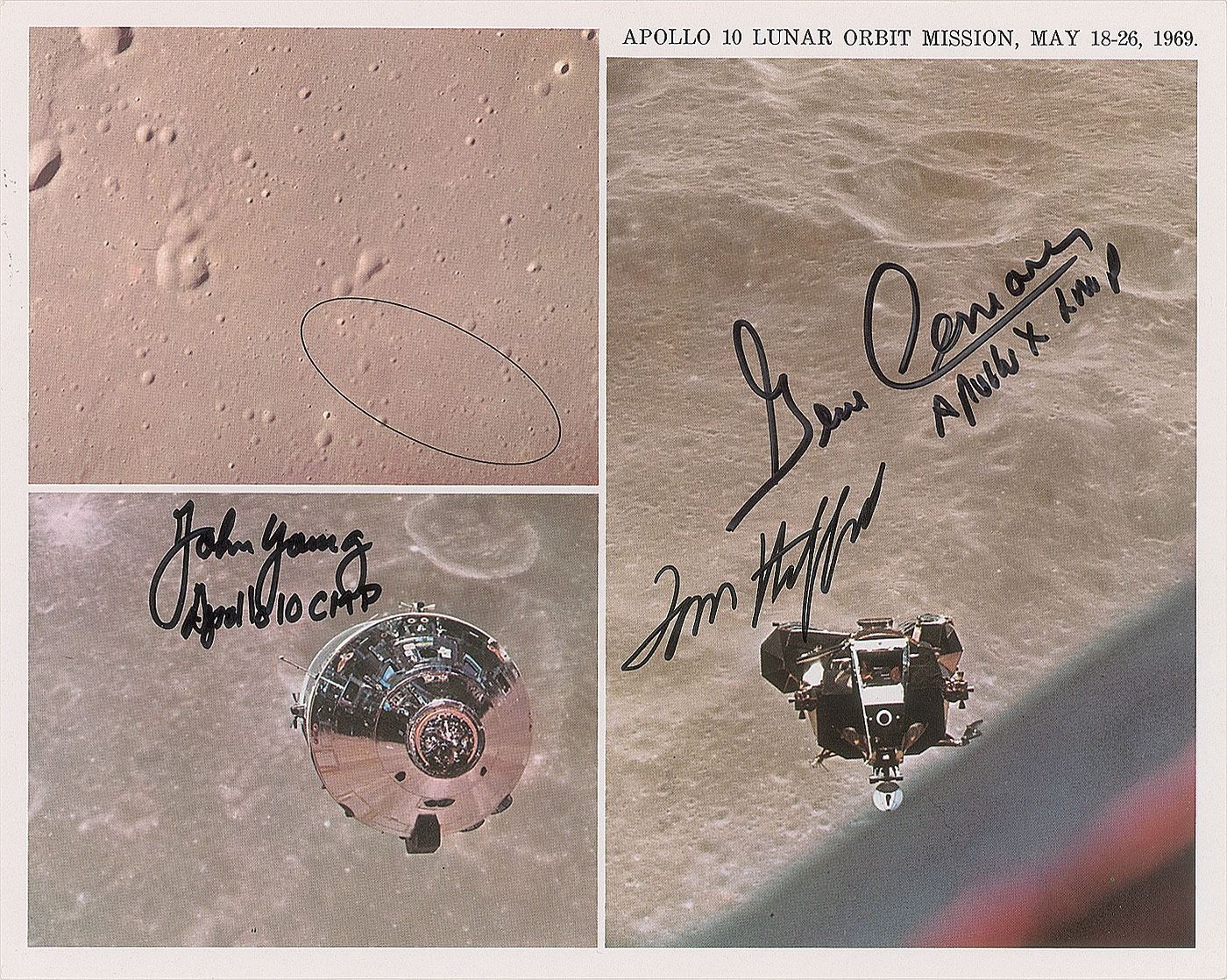 Official color 10 x 8 NASA lithograph showing images of the Sea of Tranquility landing site and Apollo 10 spacecraft, signed in black felt tip, "Gene Cernan, Apollo X LMP," "Tom Stafford," and "John Young, Apollo 10 CMP." In fine condition. Accompanied by a certificate of authenticity from Astronaut Central for the Young signature.