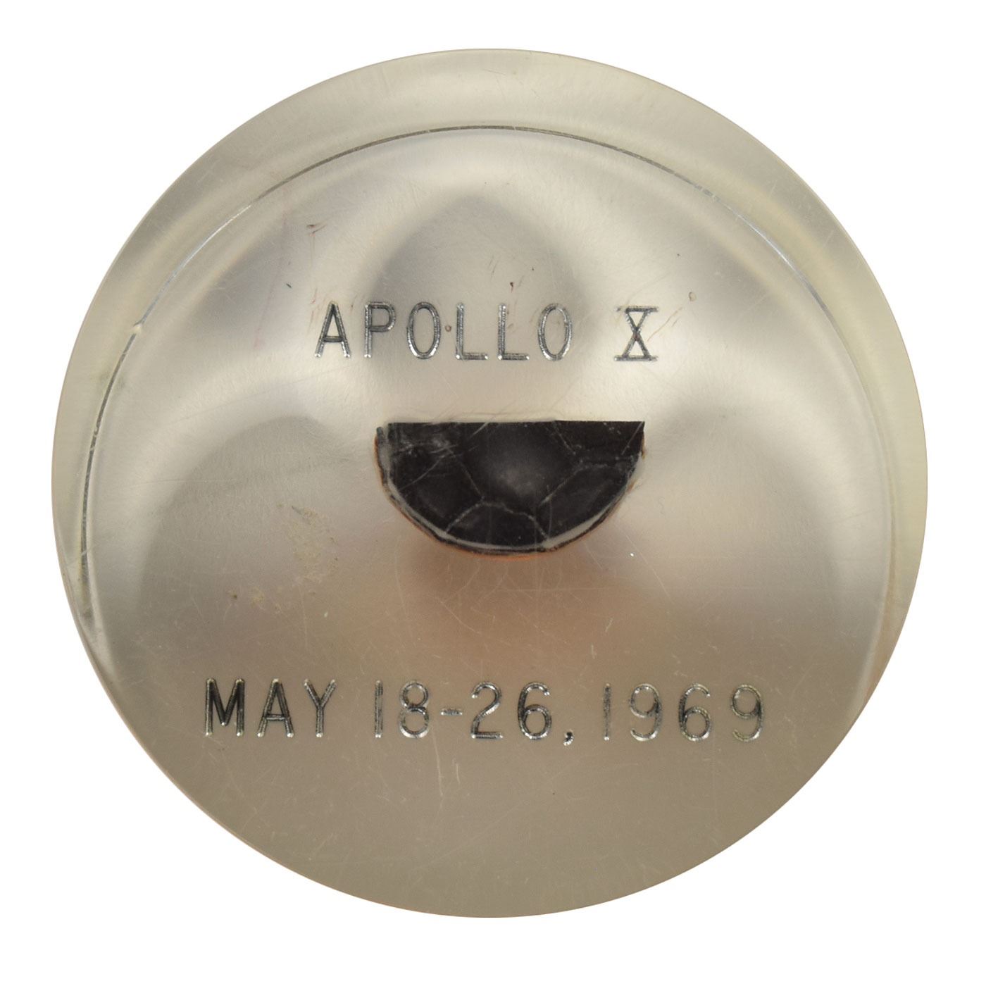 Flown heatshield plug recovered from the Apollo 10 Command Module Charlie Brown, presented in a cylindrical Lucite display, measuring 3? in diameter and 2.5? tall, etched on the bottom with black text, "Apollo X, May 18–26, 1969." In fine condition, with a few minor scratches. Heatshield plugs are made of a lightweight fiberglass honeycomb, which is hand-filled with an ablative resin material in order to limit heat exposure during re-entry. This originates from Command Module Pilot John Young's personal collection, and was previously signed across the top in black felt tip; the signature has faded to indecipherability.