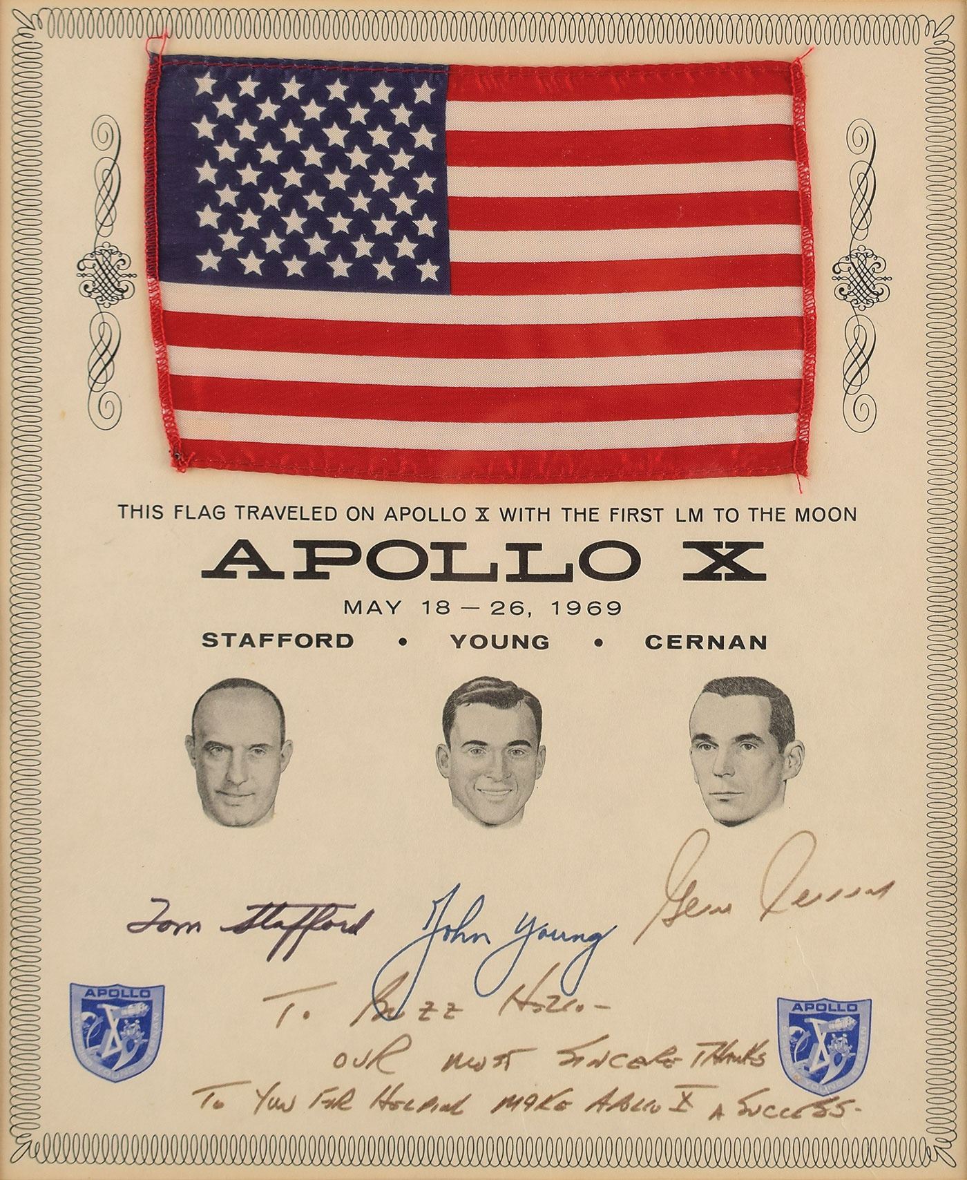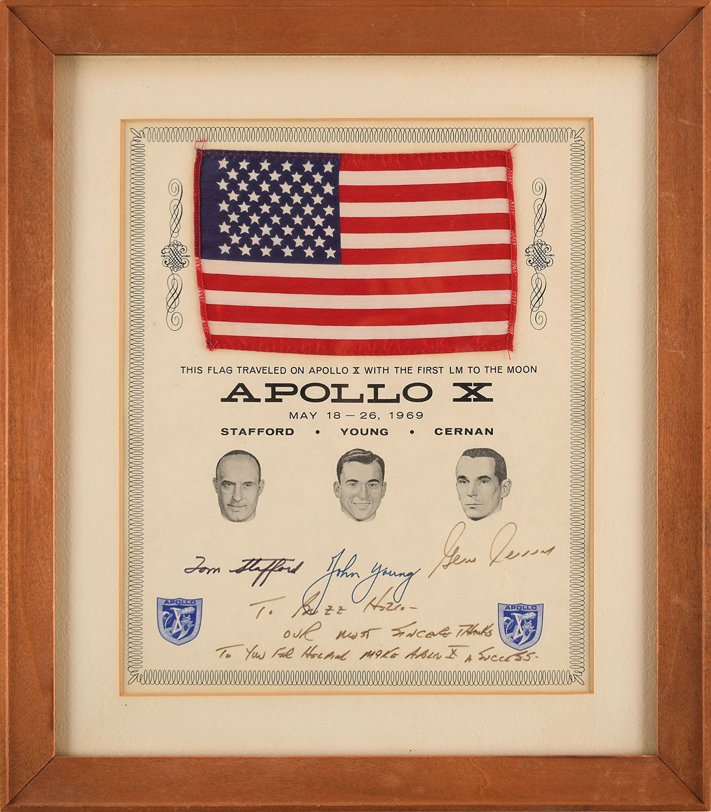 Flown fabric American flag, 6.25 x 4, carried into lunar orbit during the Apollo 10 mission, affixed to a 9.25 x 11.25 presentation certificate signed and inscribed in black tip, "Gene Cernan, To Buzz Hello—Our most sincere thanks to you for helping make Apollo X a success." The certificate bears autopen signatures of Tom Stafford and John Young, with printed text below flag reading: "This flag traveled on Apollo X with the first LM to the Moon, Apollo X, May 18-26, 1969." Matted and framed to an overall size of 13.75 x 15.75. In fine condition.