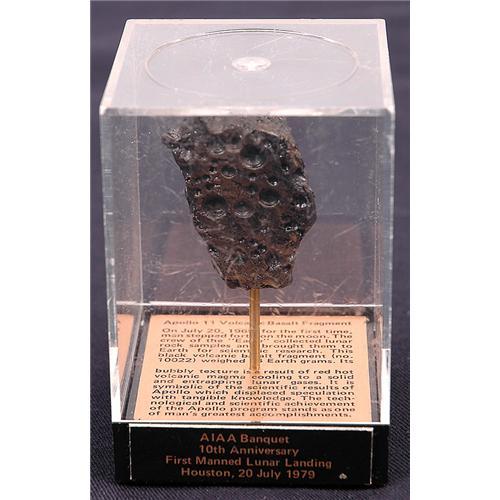 <Our item number 136939><B>Apollo 11, 1979, "10th Anniversary AIAA Banquet" Presentation Moon Rock Model.</B> (1.5x1") This simulated moon rock is mounted in a clear plastic lucite case (2.25x2.25x3.5") with a descriptive base that reads: "AIAA Banquet / 10th Anniversary / First Manned Lunar Landing / Houston, 20 July 1979". We had originally thought that "party favor" was given to all who attended the banquet, but subsequent discussion with Bill Dana (who MC'd the banquet as <I>Jose Jiminez</I>) seems to indicate that this item was given only to honored guests on the podium. In either case, this simulated moon rock is quite rare and highly desirable. Minor display case rubs should not detract. <BR>Estimated Value $250 - 350. <BR><BR>Our item number 136939<BR><IMAGES><P ALIGN="CENTER"><IMG SRC="http://www.goldbergcoins.net/liveauction/49jpegs/136939.jpg"> </P></IMAGES>